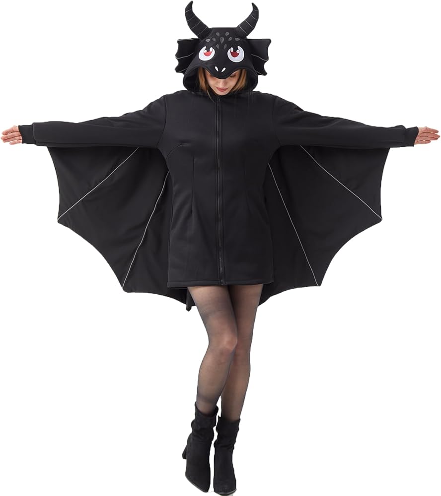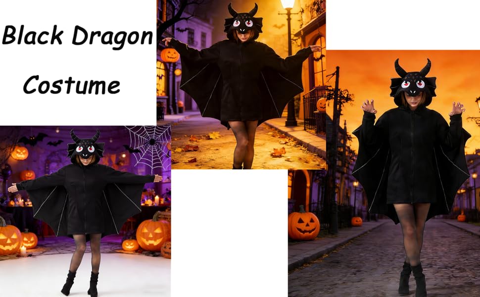 مظهر خيالي مذهل مستوحى من التنين: يتميز تصميم زي التنين الأسود هذا بقبعة مطرزة رائعة وخطوط جناح سوداء جريئة، مما يخلق مظهرًا قوطيًا قويًا.