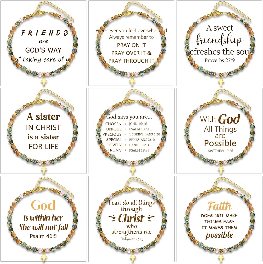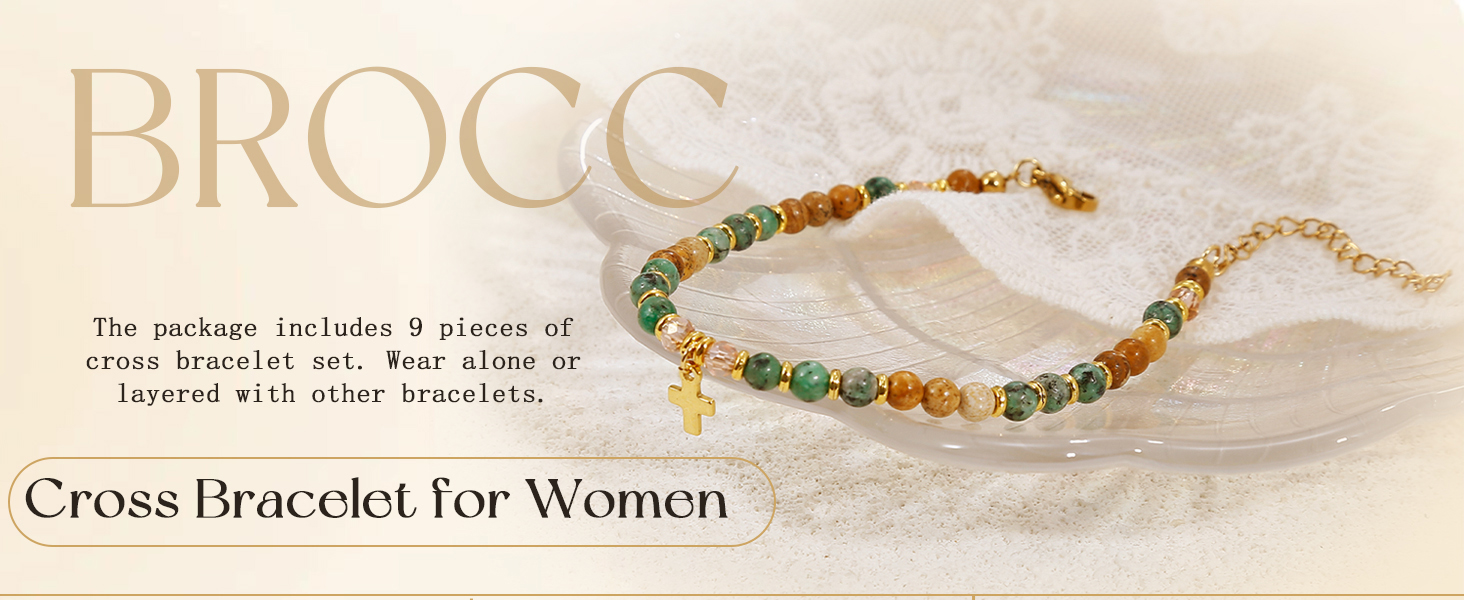 سوار كروس للنساء: تتضمن المجموعة 9 قطع من مجموعة أساور كروس. تتميز هذه الأساور المسيحية الأنيقة بحلية صليب رقيقة، مزينة بأحجار طبيعية ملونة. يمكن ارتداؤه بمفرده أو مع طبقات من الأساور الأخرى