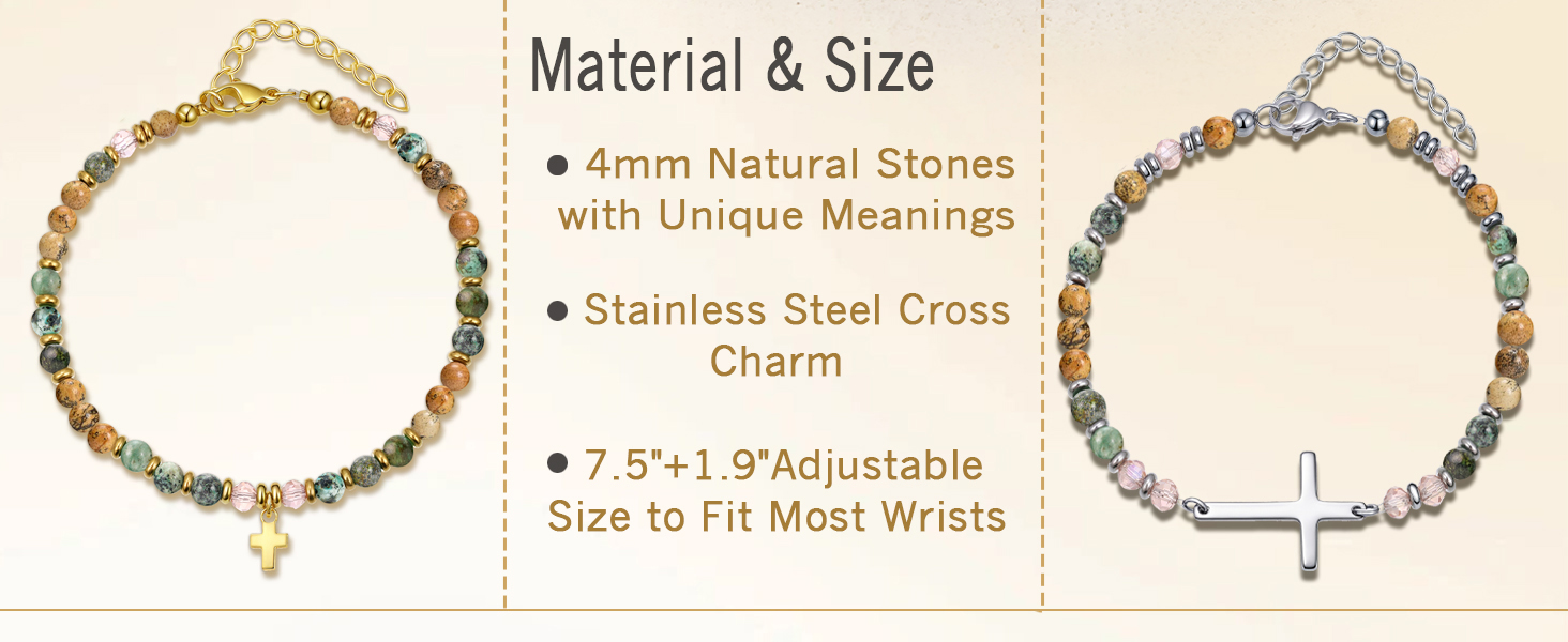 جودة فاخرة: مصنوع يدويًا من أحجار طبيعية نابضة بالحياة مقاس 4 مم وخرز من الفولاذ المقاوم للصدأ لا يسبب الحساسية. سحر الصليب هو رمز تقليدي للإيمان والتفاني. يمكن ارتداؤه بمفرده أو مع طبقات من الأساور الأخرى.