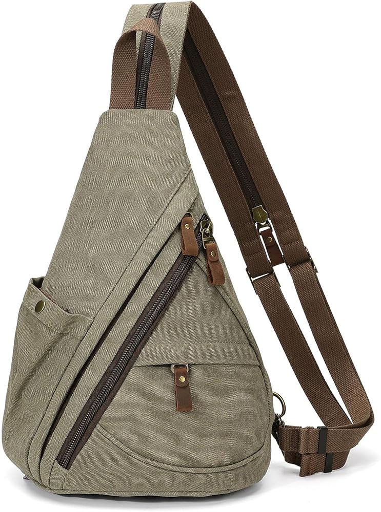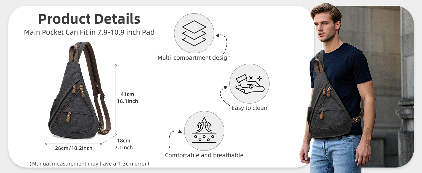 [تصميم خفيف الوزن وأنيق] مصنوعة من مادة قماش عالية الكثافة وخفيفة الوزن ومقاومة للماء مع سحابات عالية الجودة وتركيبات نحاسية، أبعاد حقيبة الظهر الصغيرة التي تمر بالجسم: 10 × 7 × 16 بوصة / تزن 1.54 رطل، هذه الحقيبة هي الإصدار الكبير.