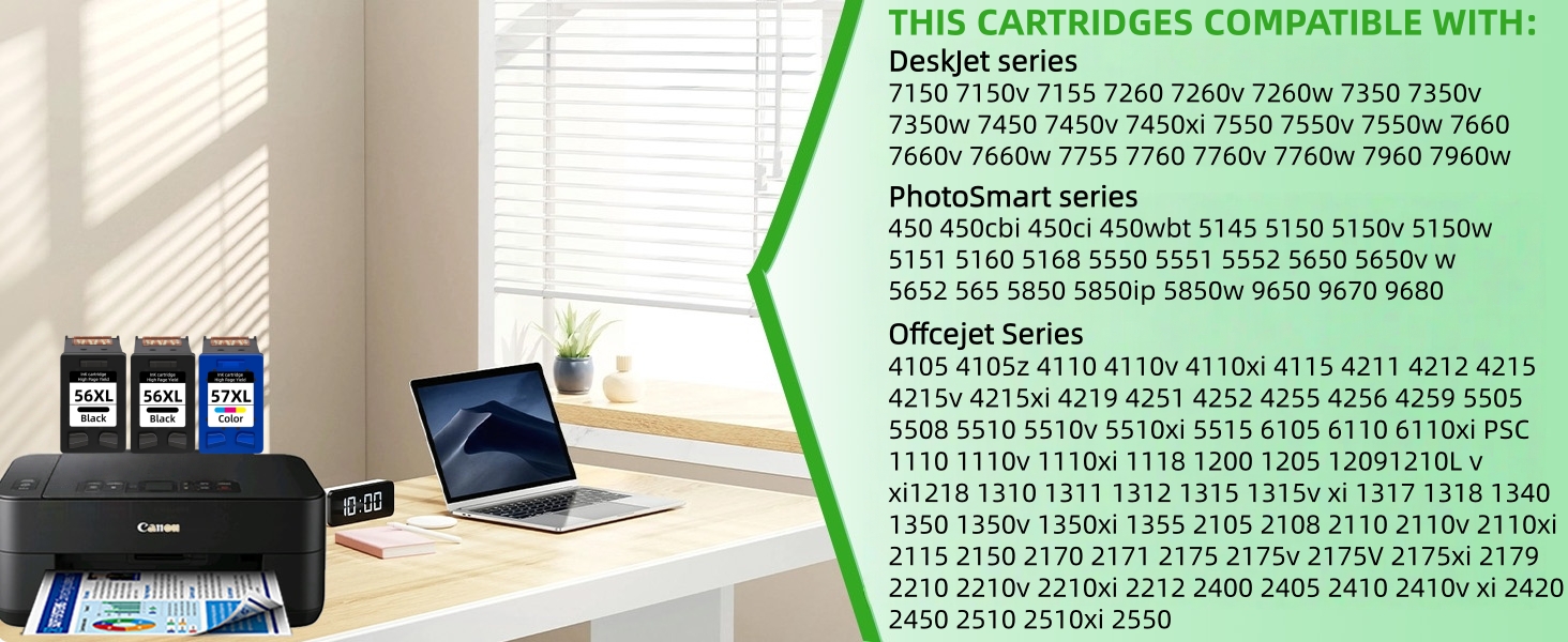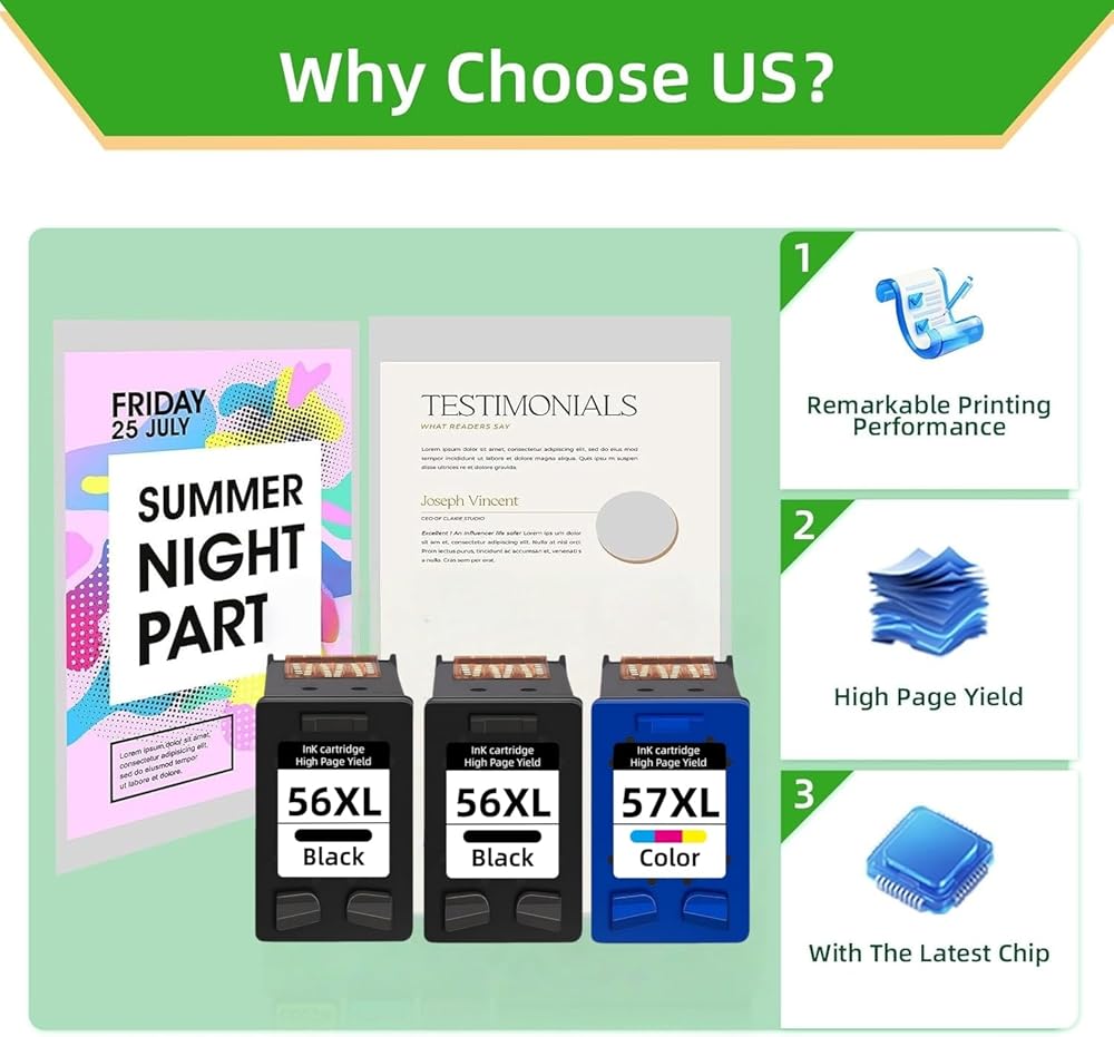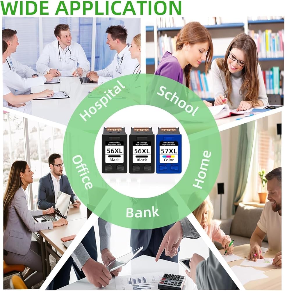 • محتوى العبوة: 2 خراطيش حبر سوداء و1 خرطوشة حبر ملونة تم إعادة تصنيعها كبديل حبر 56XL 57XL، مناسبة لحبر HP 56 57
