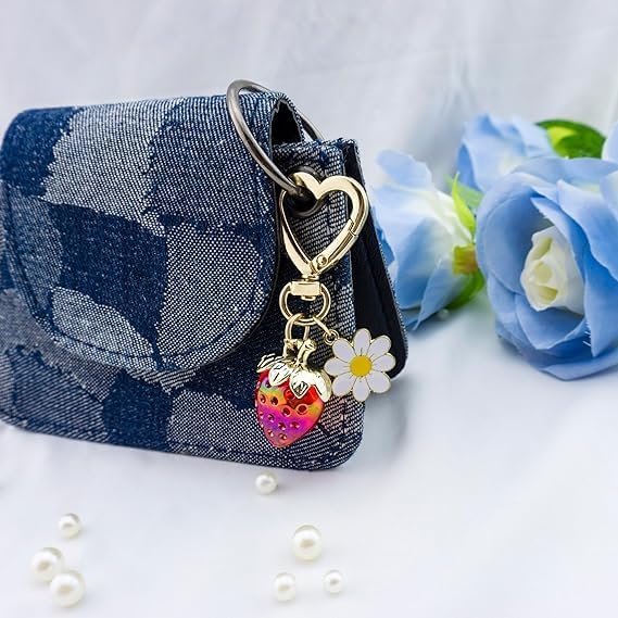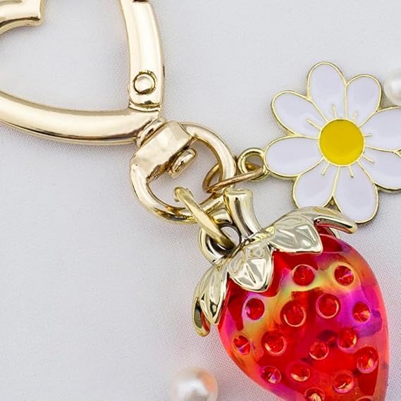 تصميم Kawaii رائع - يتميز بسحر الفراولة القزحية، وسحر زهرة الأقحوان الجميلة، ومشبك على شكل قلب. ديكور لطيف وأنيق للمفاتيح والمحافظ وحقائب الظهر والحبال والحقائب.