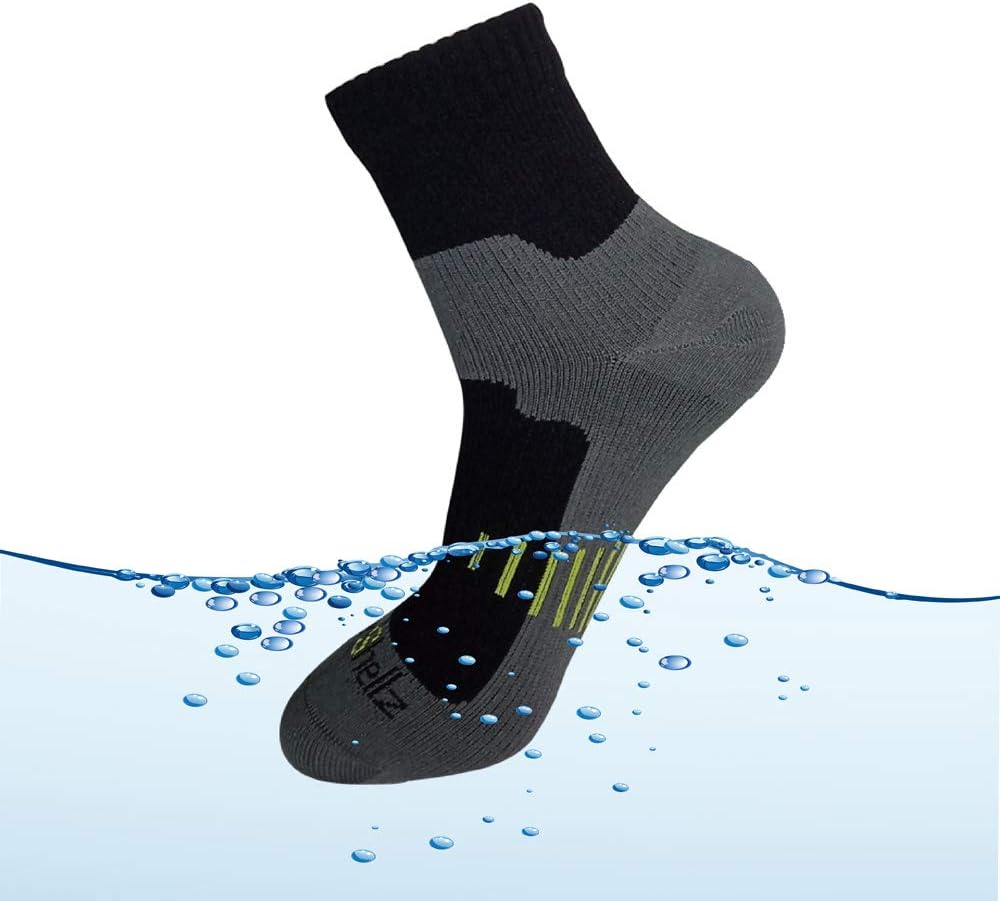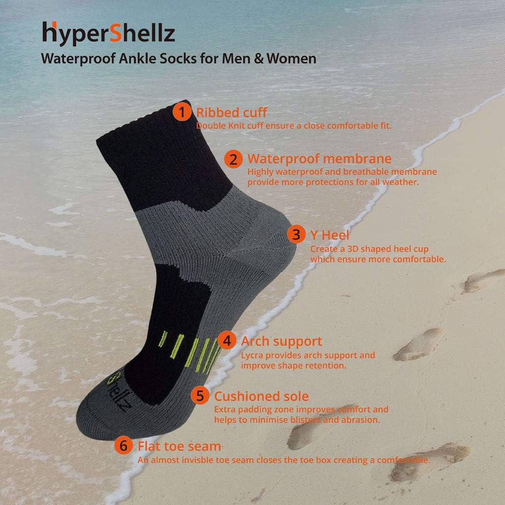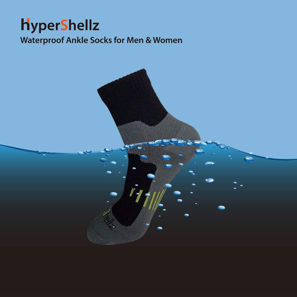 HyperShellz waterproof socks are midweight seamless socks, excellent for any outdoor sports where need to keep the feet dry and warm.Features include:Three Layers Design:The sock is made by three layers, the outer layer, the middle membrane and the inner layer.Materials: The outer is 80%Nylon/20%Lycra, durable and quick dry, the lycra provide very good elasticity. The middle is highly breathable waterproof membrane. The inner is Merino wool which provide moisure transfer and nice touch feeling.Performance:Excellent waterproof and breathable performance, the waterproof hydrostatic pressure is more than 8000mm H2O, water vapor permeability is more than 12000g/m2/24h.