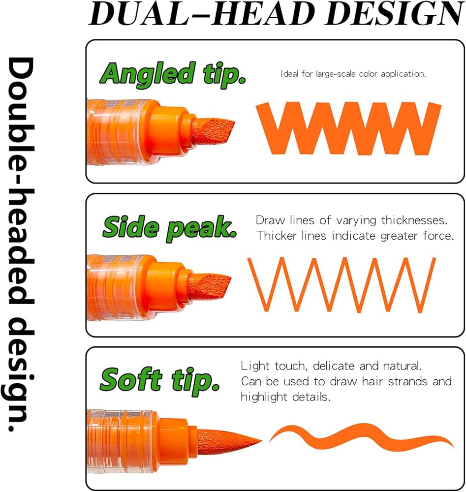 👍أقلام التحديد المائية ذات الرأس المزدوج لخرطوشة الحبر النقي: على عكس أقلام التحديد التقليدية المصنوعة من القطن، تتميز هذه بخرطوشة حبر نقي بتصميم كبير السعة وآلية كرة فولاذية داخلية تسمح بتدفق أكثر سلاسة للحبر عند هز القلم قبل الاستخدام. يشتمل تصميم الطرف المزدوج على طرف صلب منحوت (1-4 مم) مثالي للفنون البصرية والتصميم الصناعي والفن البيئي وما إلى ذلك، في حين أن رأس الفرشاة (1-6 مم) مثالي للرسوم المتحركة وتصميم الأزياء وما إلى ذلك.