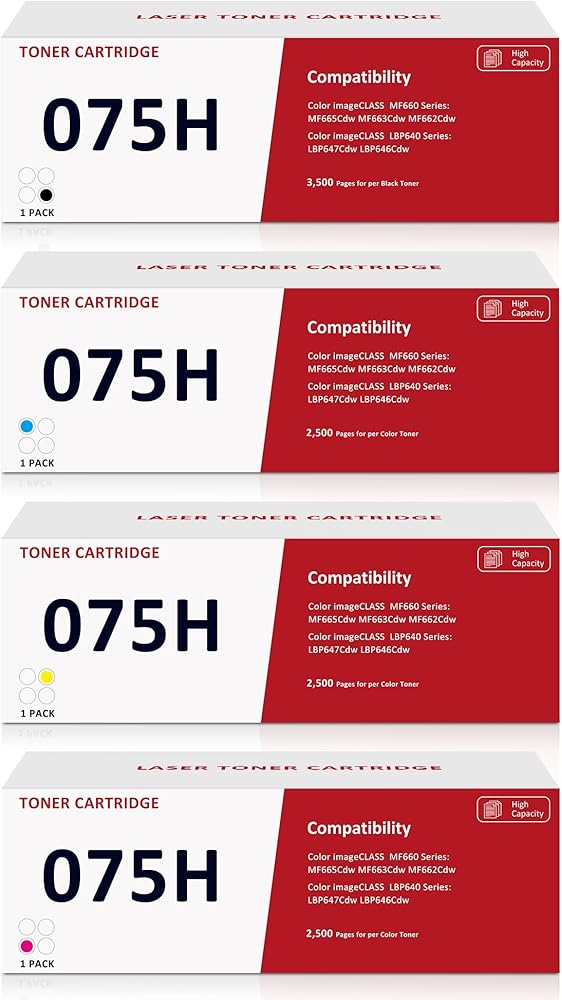 توافق واسع للطابعة: خرطوشة حبر بديلة 075 عالية السعة لمجموعة خرطوشة حبر Canon 075، متوافقة مع Canon imageCLASS LBP640 LBP640C LBP646Cdw LBP647Cdw MF660 MF660C MF662Cdw MF663Cdw MF665Cdw Series Printer، بالإضافة إلى الطرز ذات الصلة في سلسلة LBP640/MF660. وهي مجهزة بشريحة تعرف ذكية، وتتواصل بسلاسة مع الطابعة الخاصة بك للتخلص من مخاوف التوافق