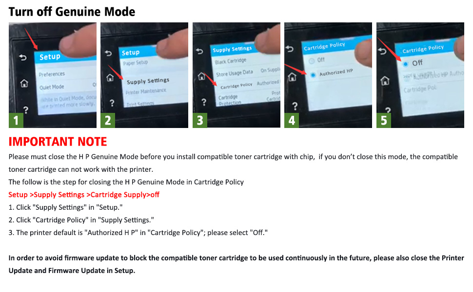 【ملاحظة مهمة 】: يرجى إغلاق الوضع الأصلي قبل التثبيت، والخطوة هي الإعداد>إعدادات الإمداد>إمداد الخرطوشة>إيقاف التشغيل. لتجنب تحديث البرنامج الثابت لمنع استخدام خرطوشة الحبر المتوافقة بشكل مستمر في المستقبل، يرجى أيضًا إغلاق تحديث الطابعة وتحديث البرنامج الثابت في الإعداد.