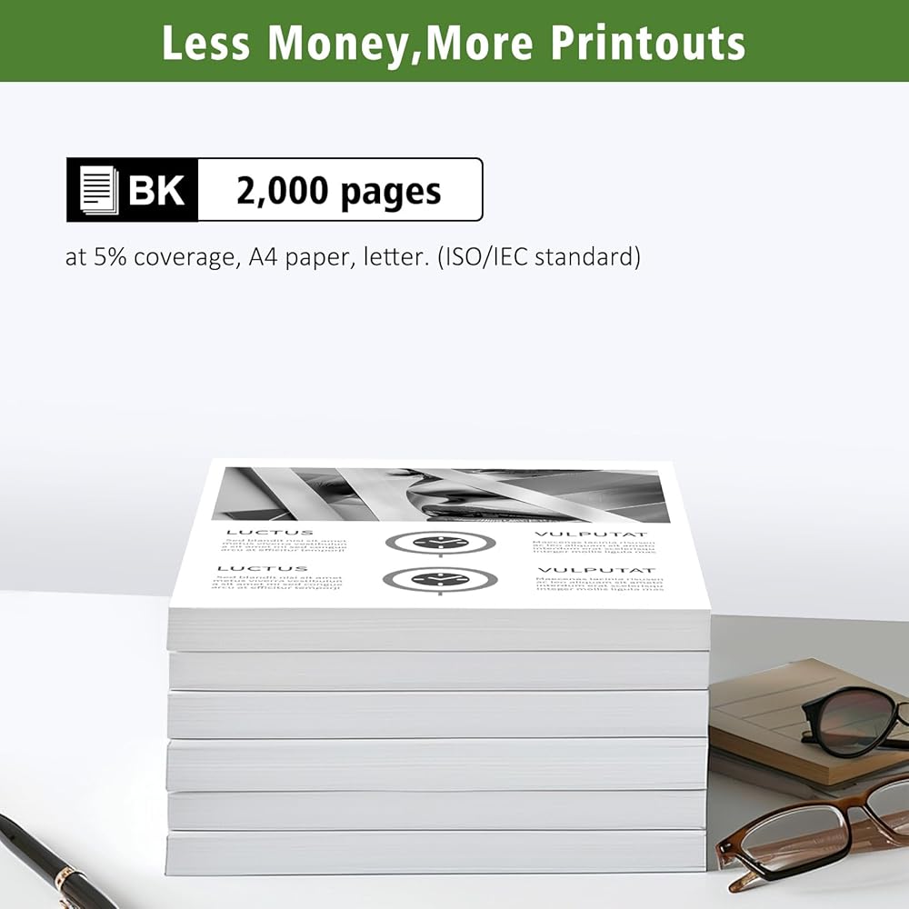 【 إنتاجية الصفحة】 سعة عالية، حوالي 2000 صفحة باللون الأسود مع تغطية 5%، ورق A4، خطاب. (معيار ISO/IEC).