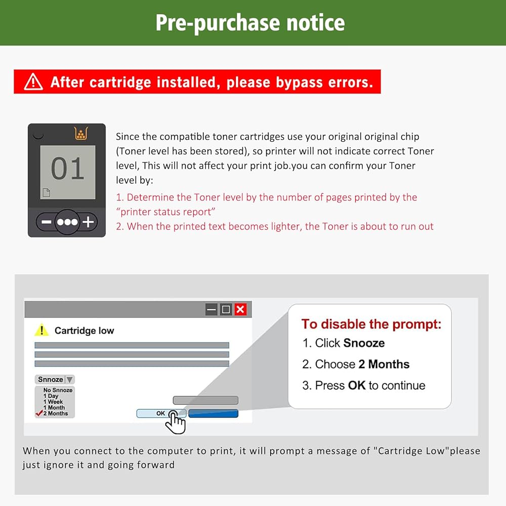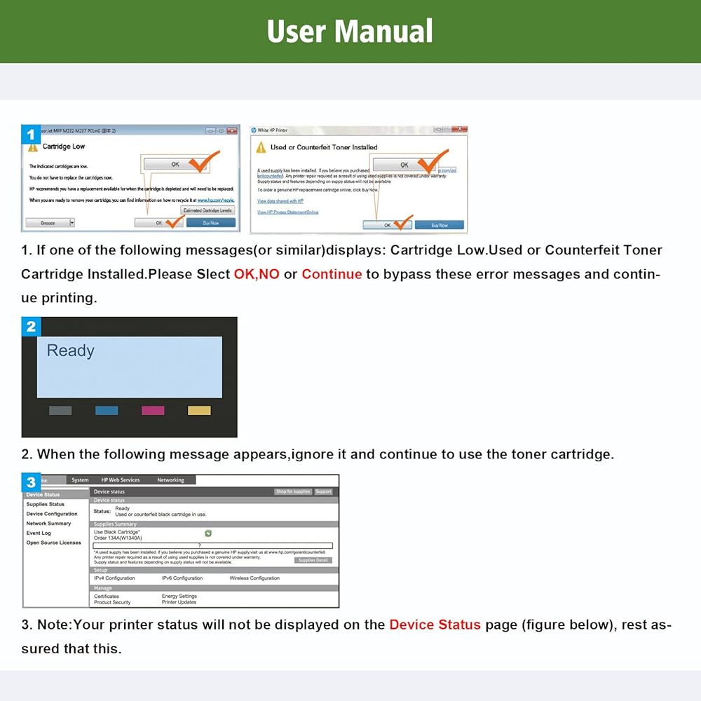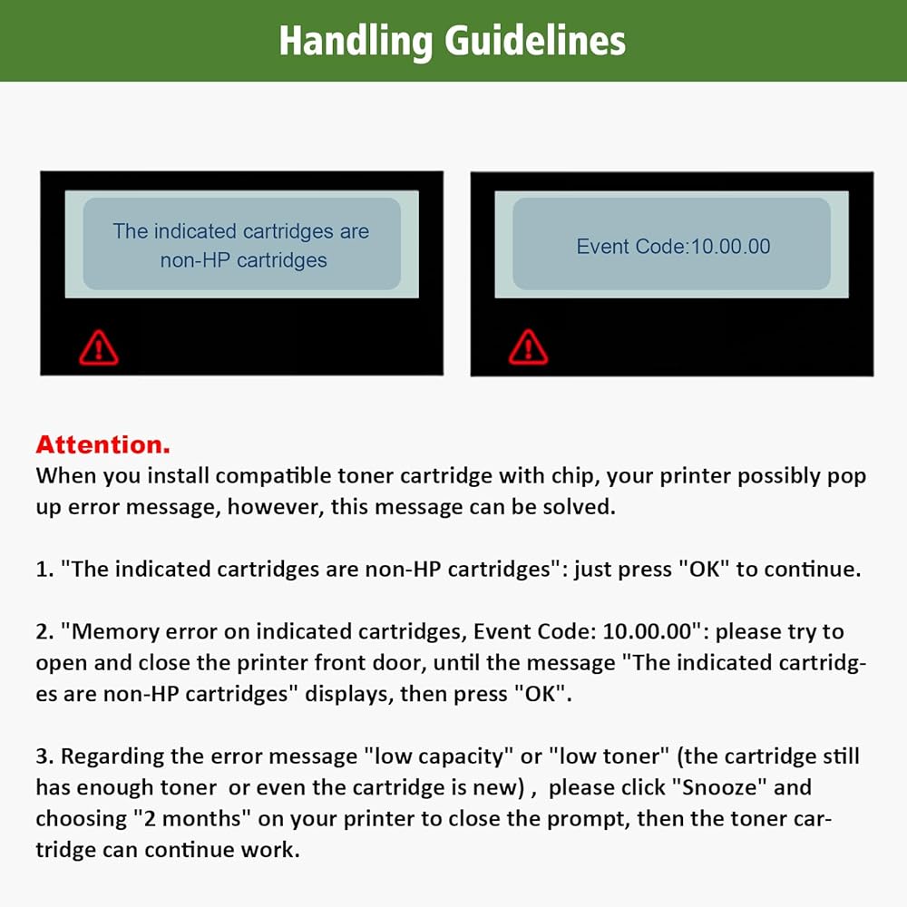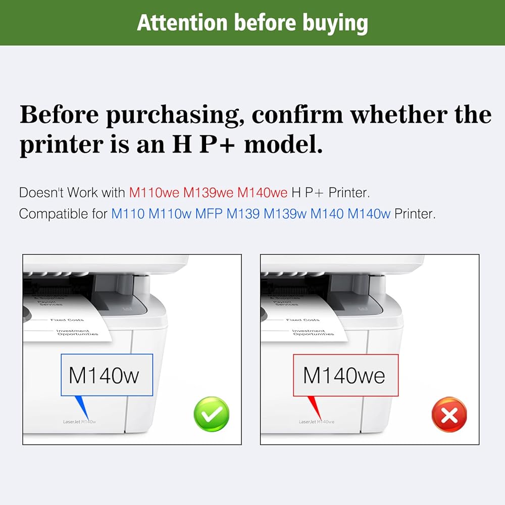 【❗❗❗ إشعار التوافق】 خرطوشة الحبر المتوافقة لدينا غير مناسبة لطابعات HP+ التي تنتهي أسماء طرازاتها بالحرف "e." تم تصميم هذه الطابعات للعمل حصريًا مع خراطيش HP الأصلية. مسحوق الحبر المتوافق الخاص بنا متوافق فقط مع الطابعات غير HP+ التي لا تحتوي على حرف "e" في اسم الطراز.