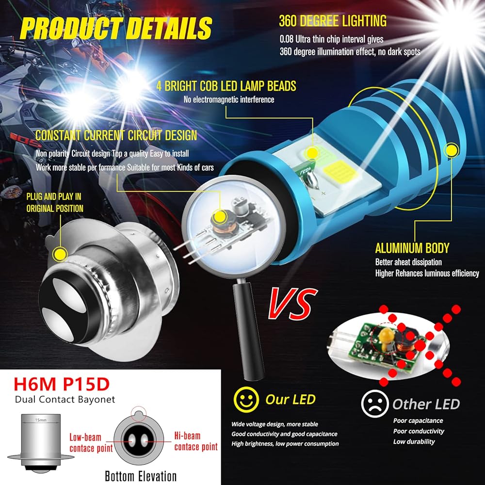 Double Colors Beam H6M LED Bulbs:4pcs high power COB chips/bulb;ice blue(8000K) light for low beam,light penetrates more and shines farther;White(6000K) light for high beam;More personalized LED bulbs.
