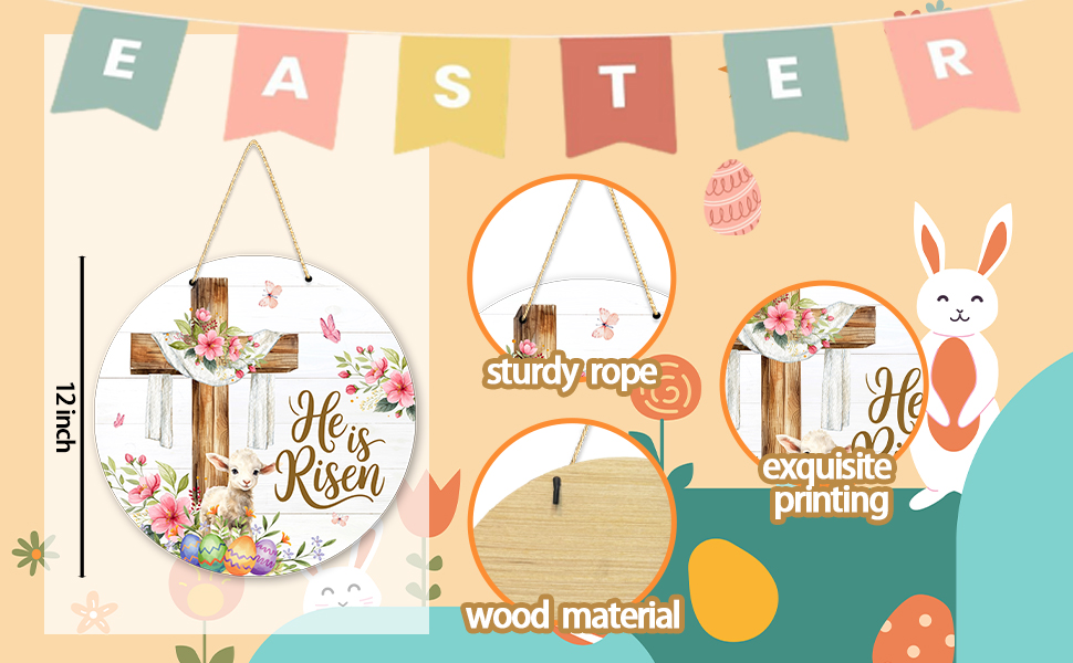 - الأبعاد: لافتة خشبية دائرية مثالية مقاس 12 بوصة، حجم مثالي للباب أو الحائط أو النافذة أثناء احتفالات عيد الفصح (تتضمن العبوة حبلًا من الجوت)
