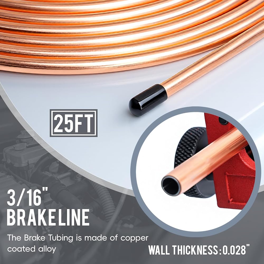 【خط فرامل مطلي بالنحاس الممتاز】تتميز مجموعة خطوط الفرامل مقاس 3/16 بوصة بأنابيب فولاذية مطلية بالنحاس عالية الجودة تتميز بالمرونة والمقاومة للتآكل. مثالية للمركبات التي تواجه الظروف الجوية القاسية، وتضمن هذه المجموعة أداءً موثوقًا ومتانة.