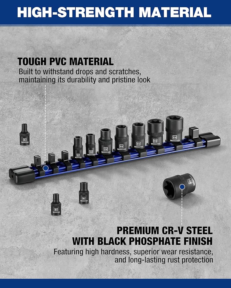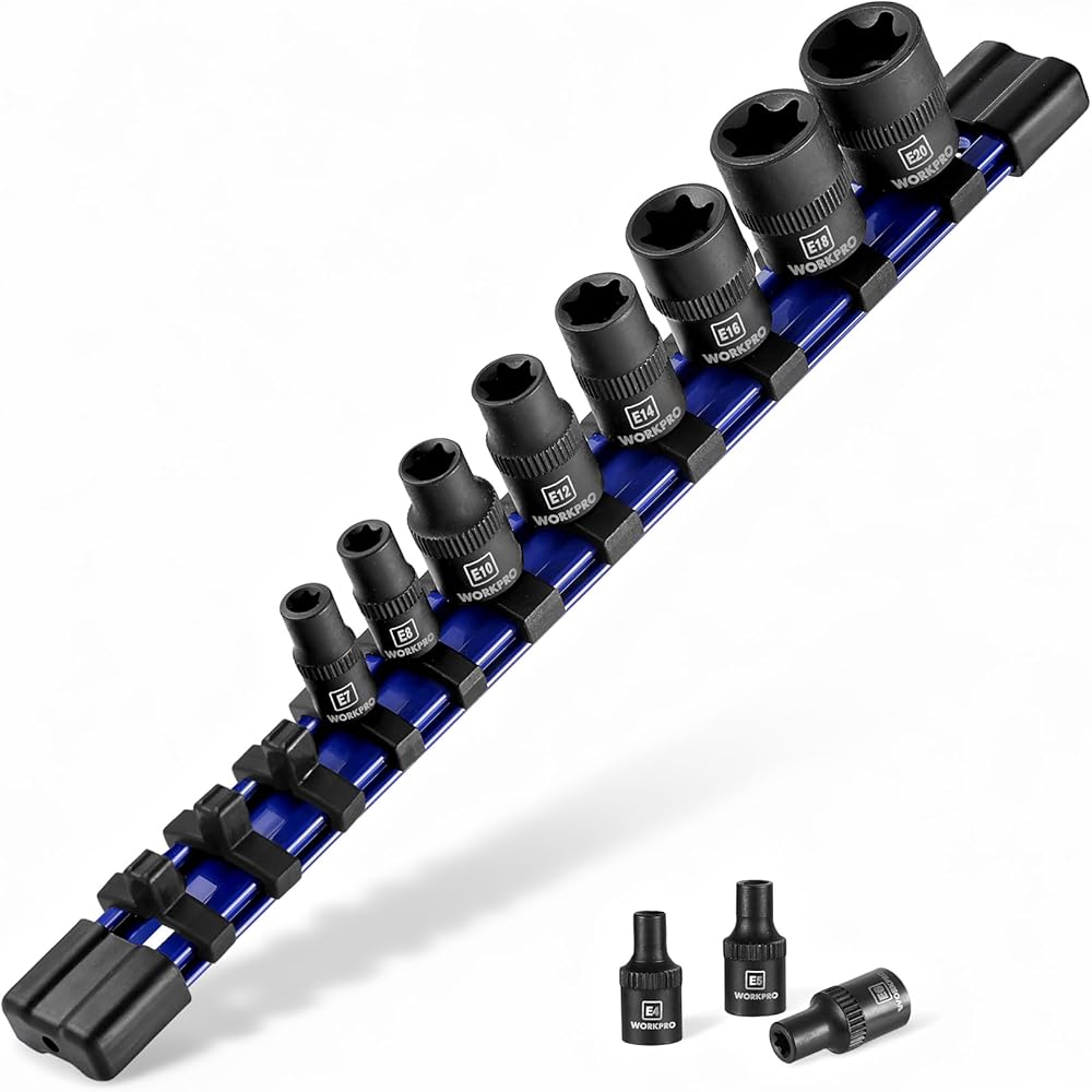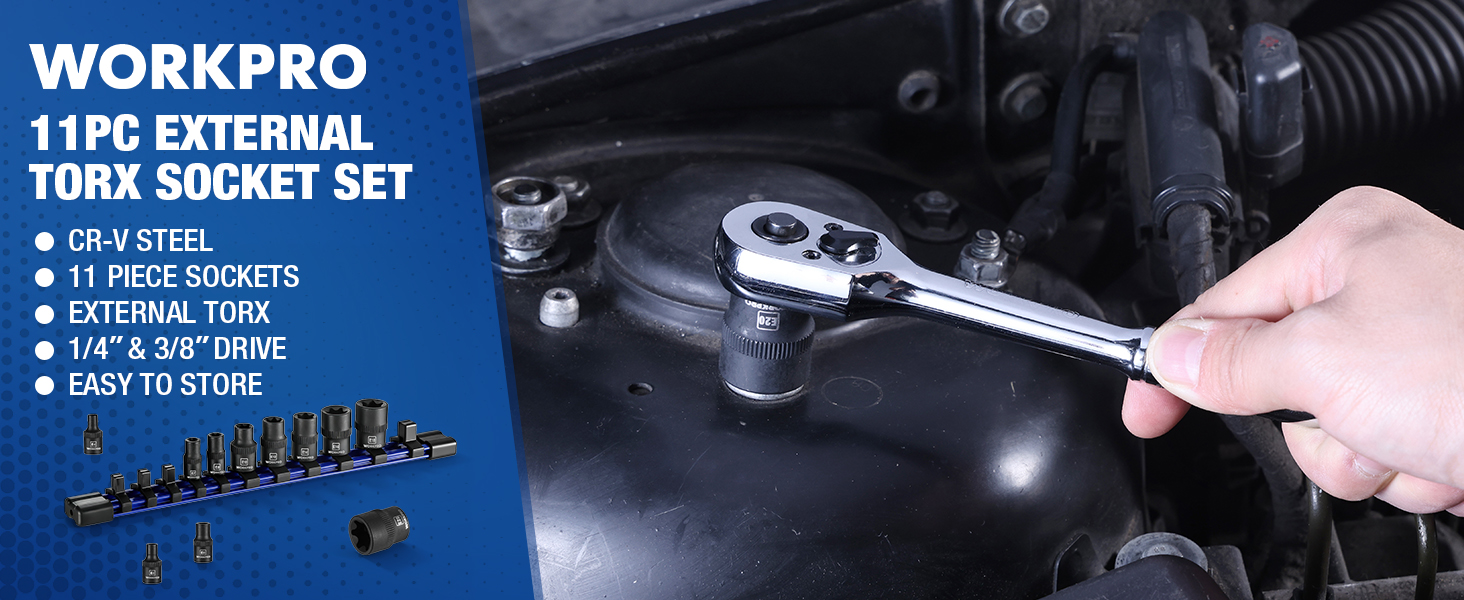مجموعة مقابس توركس 11 قطعة من WORKPRO، مجموعة مقابس نجمة محرك 1/4 بوصة 3/8 بوصة، مجموعة مقابس توركس خارجية من الفولاذ CR-V (مقبس E4-E20) مع منظم مقبس PVC، مثالية للدراجات النارية والسيارات والإصلاح الميكانيكي