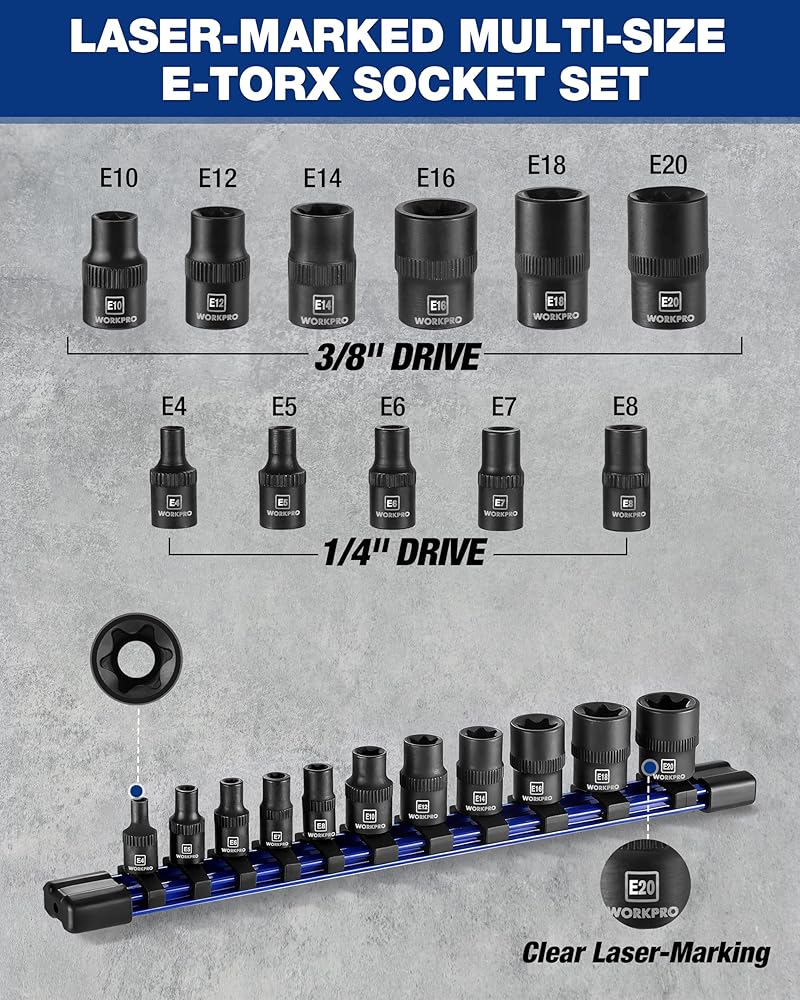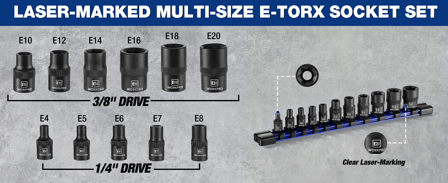مجموعة مقابس نجمية متعددة الأحجام تحمل علامة ليزر: تتضمن 5 قطع من مقابس محرك 1/4 بوصة (E4، E5، E6، E7، E8) و6 قطع من مقابس محرك 3/8 بوصة (E10، E12، E14، E16، E18، E20)، مع علامات واضحة محفورة بالليزر للتعرف السريع، بالإضافة إلى منظم مقبس لسهولة الوصول والتخزين