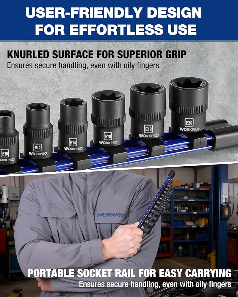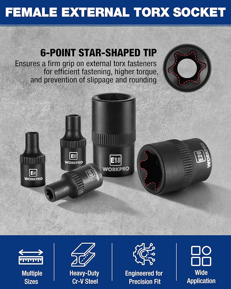 تطبيقات واسعة: مجموعة مقابس توركس الخارجية WORKPRO، التي توفر مجموعة من الأحجام الشائعة الاستخدام، مثالية للمهام بما في ذلك إصلاحات الدراجات النارية والسيارات والميكانيكية.
