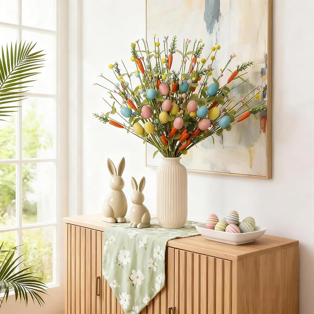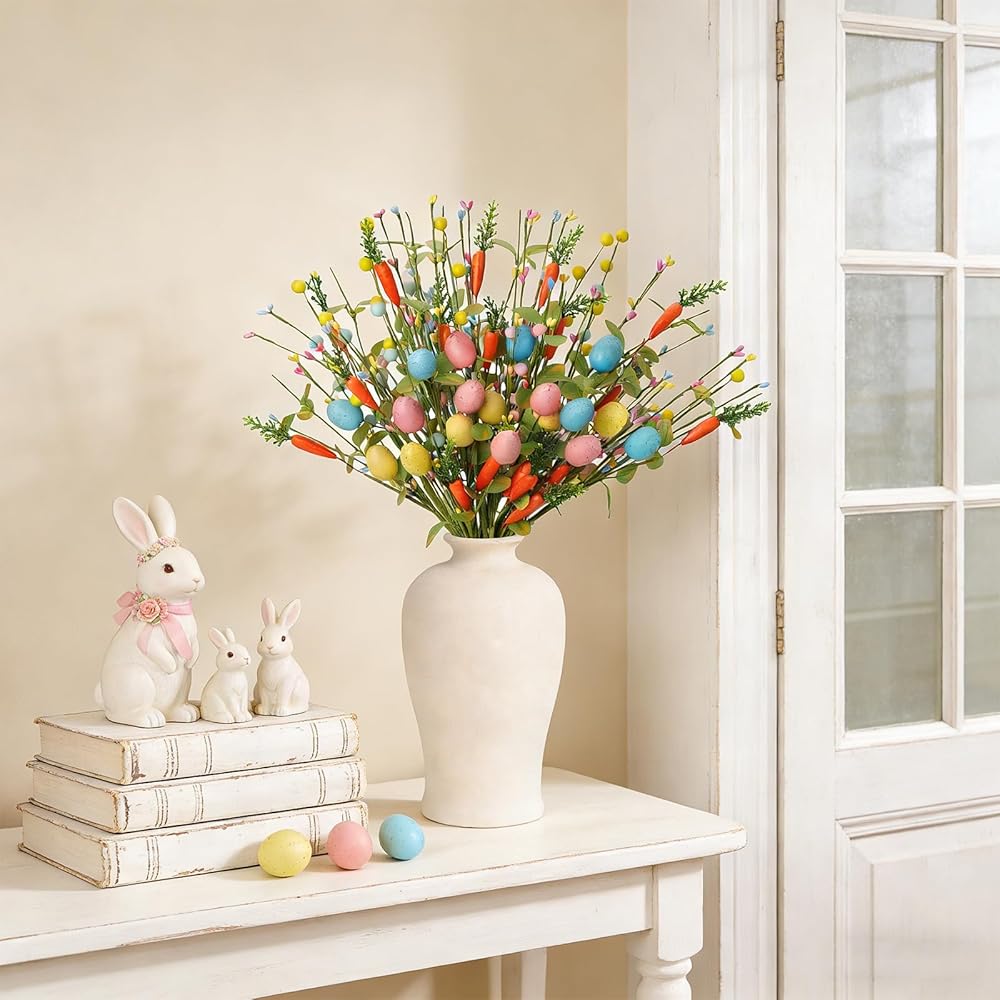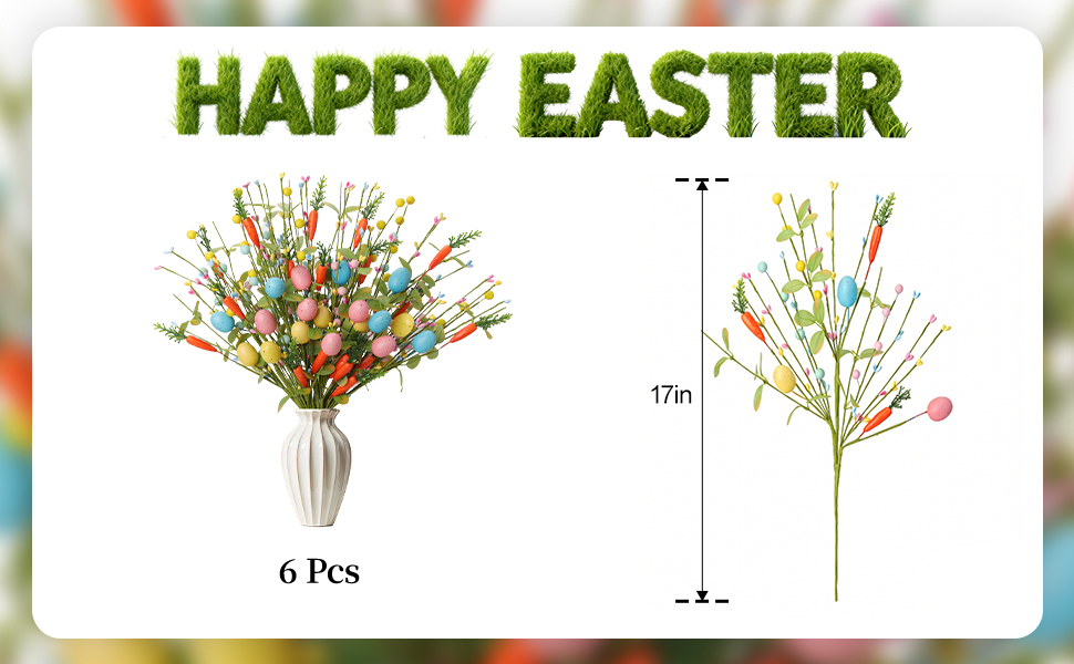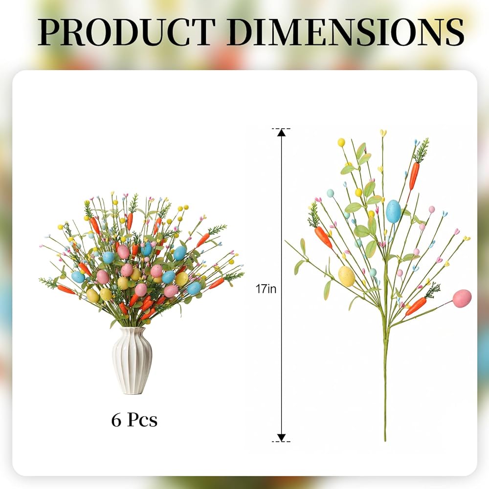 • الحجم والكمية: تتضمن العبوة 6 سيقان عيد الفصح، يبلغ طول كل منها 43.18 سم ووزنها 0.7 أونصة. تتكون كل جذع من بيض عيد الفصح الواقعي، والجزر الحمراء، والتوت الملون، وأوراق الأوكالبتوس الخضراء - مما يخلق مظهرًا مشرقًا واحتفاليًا لعيد الفصح يضيف لمسة موسمية ساحرة إلى منزلك.