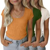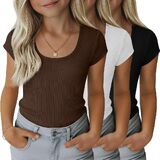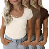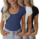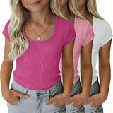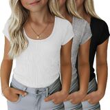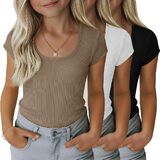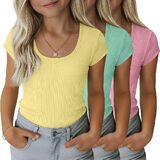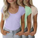 مجموعة من 3 تي شيرتات مضلعة للفتيات للأطفال بأكمام قصيرة ورقبة واسعة كاجوال منسوجة بقصة ضيقة للصيف من 5 إلى 14 سنة in Kuwait