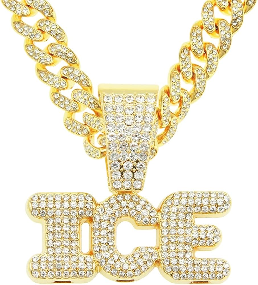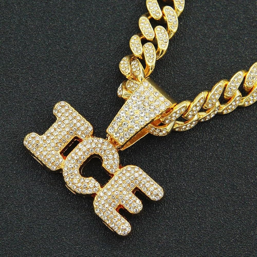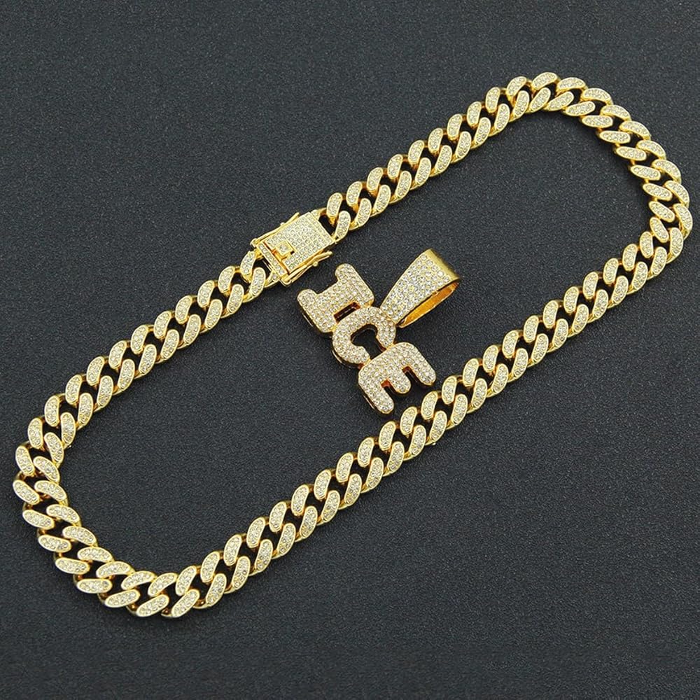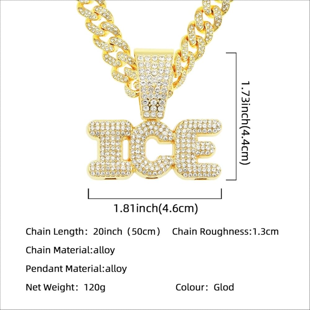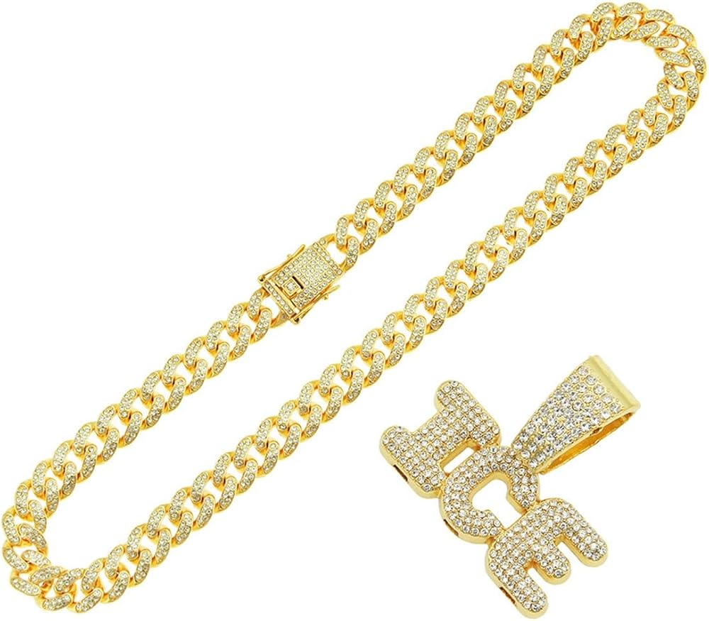 Gold letter ice cuban chain necklace, hip hop ice letter pendant necklace for men, iced out letter ice chunky necklace, sparkling ice letters cuban necklace rock rapper letter jewelry, men's gothic punk rock letters ice cuban link chain, rhinestone ice statement necklace accessories