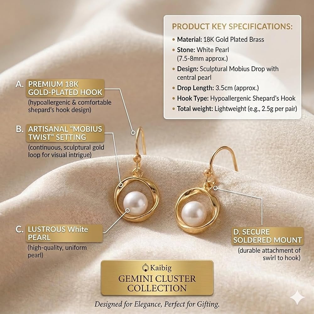 Elevate your jewelry collection with these exquisite pearl drop earrings featuring an innovative Mobius circle design. The 18K gold-plated finish creates a luxurious shine that perfectly complements the lustrous white pearl centerpiece. Each earring measures 22mm in length and 10mm in width, striking an ideal balance between statement-making and everyday elegance. The sophisticated curved design cradles each pearl in a continuous golden loop, creating a mesmerizing visual effect that catches the light beautifully. These versatile dangle earrings are perfect for special occasions like weddings and formal events, yet refined enough for daily wear. The secure fish hook closure ensures comfortable, worry-free wearing. Whether you're searching for the perfect accessory to complete your bridal ensemble or looking to add a touch of sophistication to your daily wardrobe, these pearl drop earrings make a timeless choice. They arrive beautifully packaged, making them an ideal gift for someone special in your life.