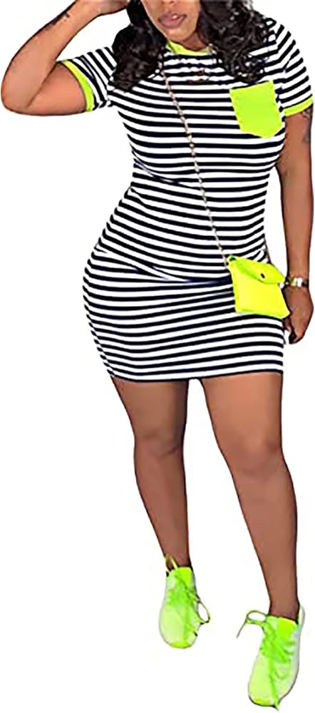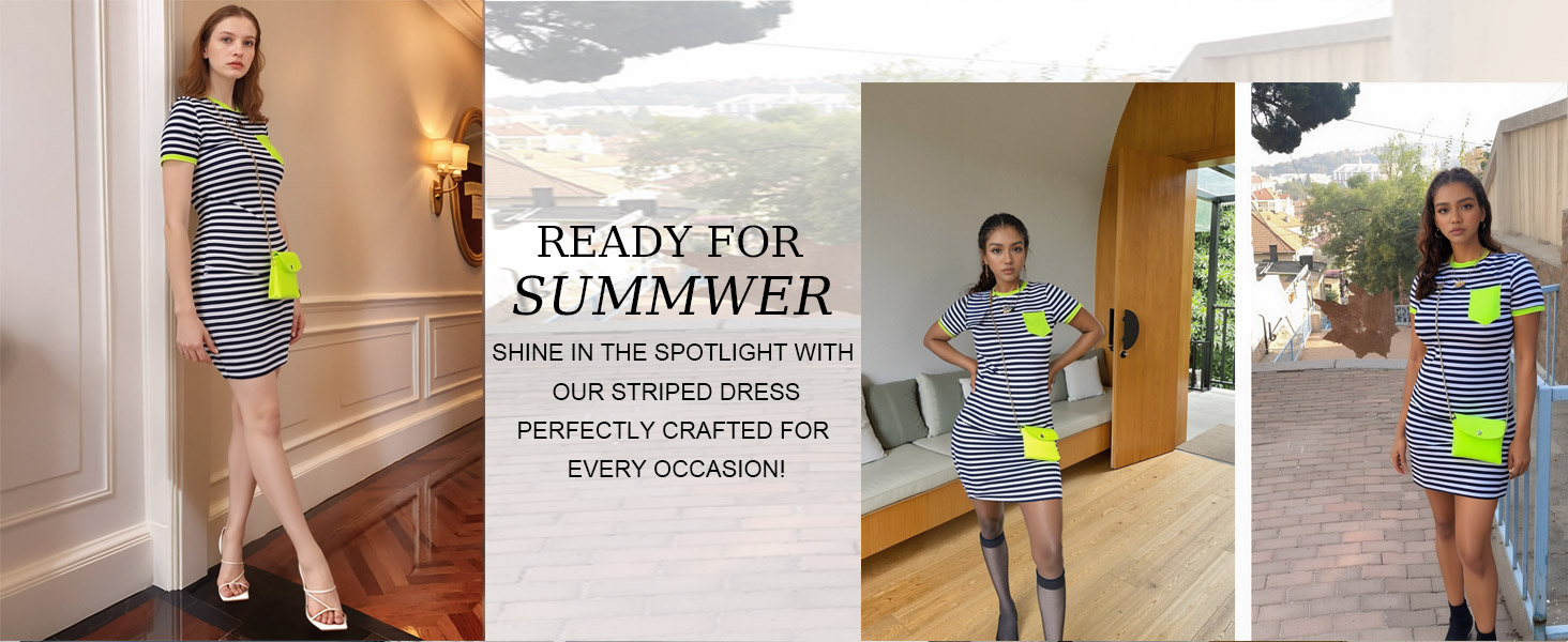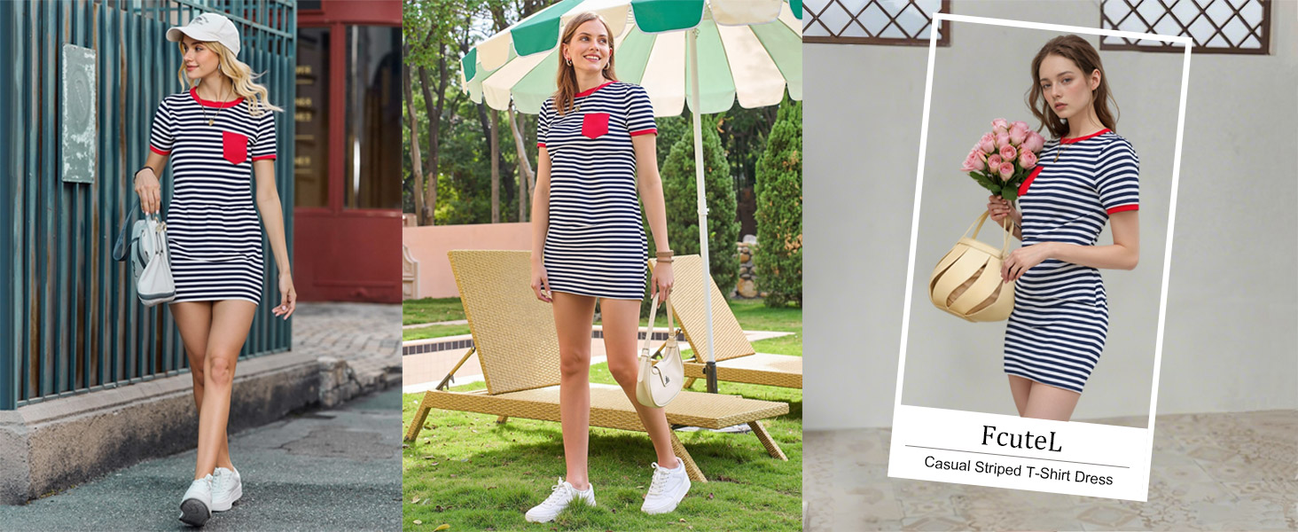 المزايا: قصة ضيقة، خطوط بألوان مختلفة.، رقبة على شكل حرف O، فستان صيفي على شكل تي شيرت. طول فوق الركبة. يضيف النمط المخطط لمسة من المرح والمقاس النحيف يبرز قوامك.