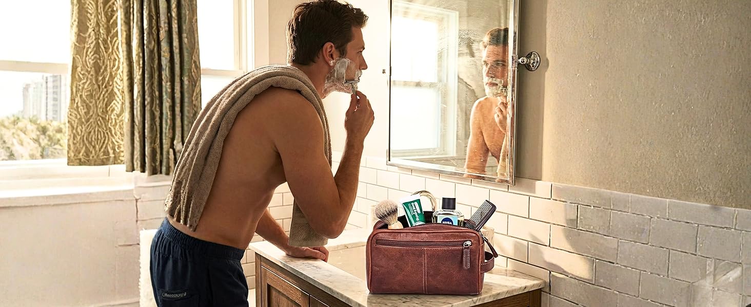 مقاوم للماء ومضاد للتسرب: لا تدع الشامبو المسكوب يفسد رحلتك. تتميز مجموعة dopp الخاصة بنا ببطانة داخلية مرنة ومقاومة للماء لاحتواء التسريبات العرضية. ما عليك سوى مسحها بقطعة قماش مبللة للحفاظ على حقيبة الحلاقة الخاصة بك طازجة وخالية من البقع