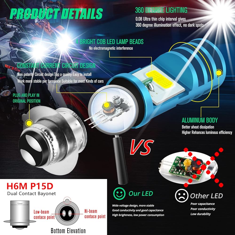 • Super Bright H6M LED Bulbs:4pcs high power COB chips/bulb;power up to 8.2watts/bulb and luminous flux up to 1800LM/bulb;Light Color:White 6000K;it 200% brighter than halogen bulb;