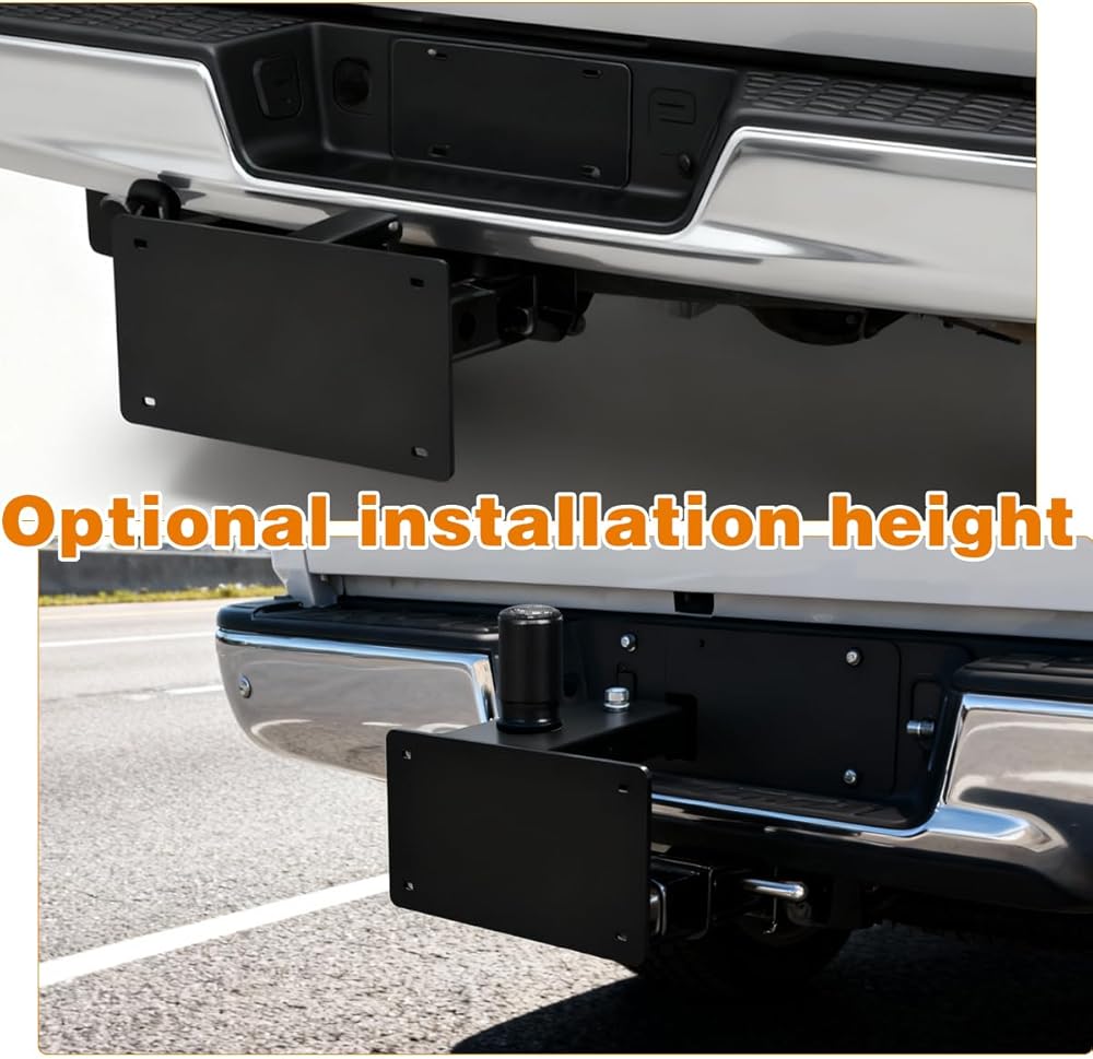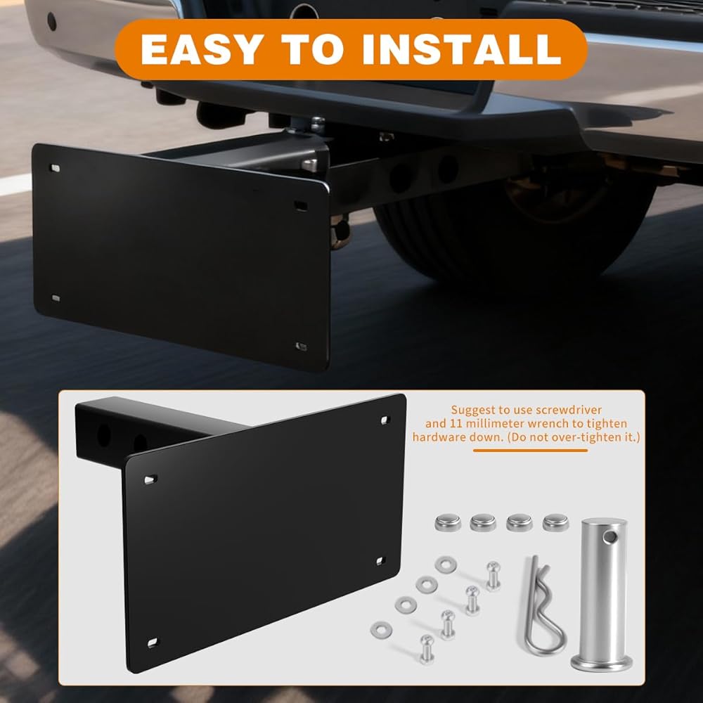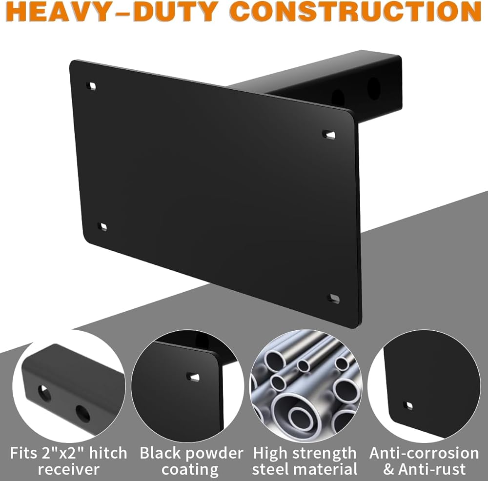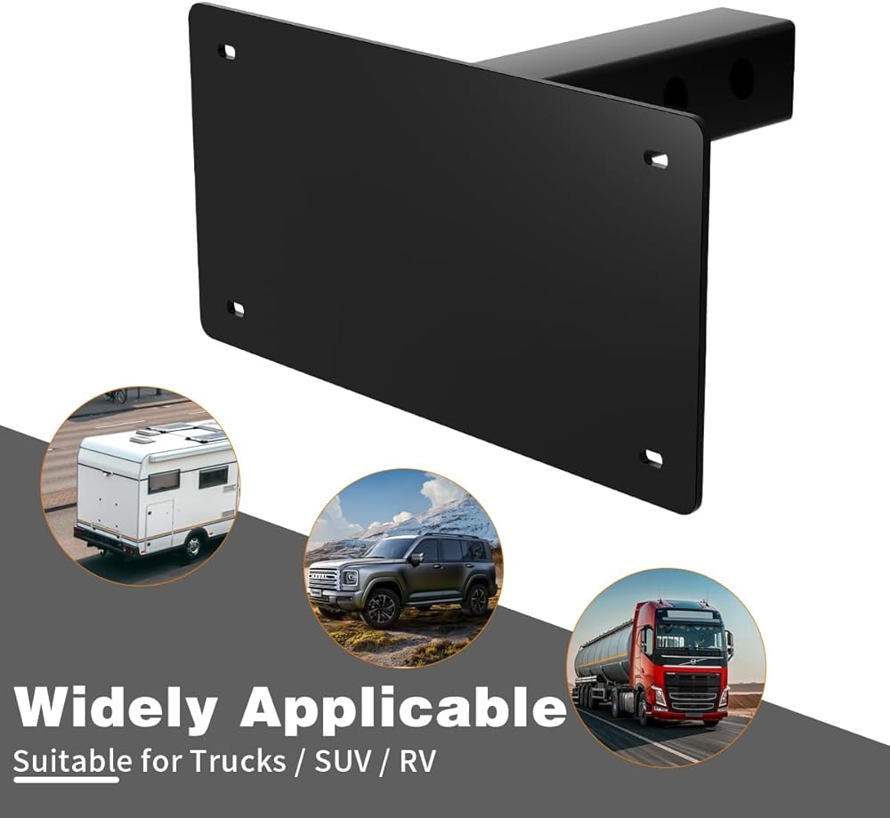 متوافقة على نطاق واسع: دعامة حامل لوحة ترخيص وصلة المقطورة للوحات الترخيص القياسية، متوافقة مع معظم المركبات، يمكن تركيبها بسهولة على الشاحنات أو سيارات الدفع الرباعي أو RVs المجهزة بمستقبلات ربط المقطورة الأمامية أو الخلفية القياسية مقاس 2 بوصة × 2 بوصة.