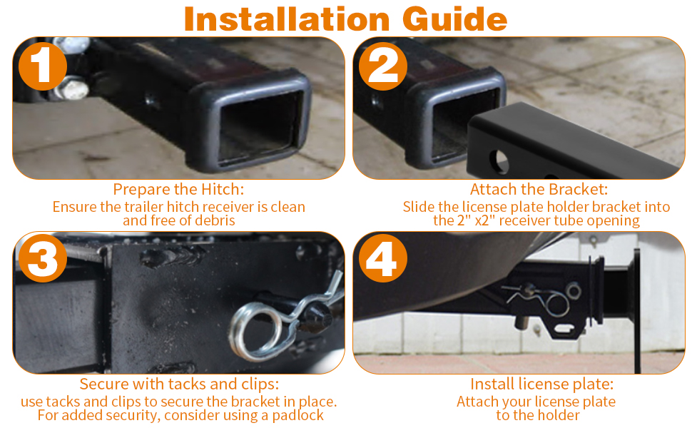 سهلة التركيب: حامل لوحة ترخيص المقطورة سهل التركيب، لا يتطلب أي ثقب، ما عليك سوى إدخال حامل لوحة ترخيص المقطورة في فتحة جهاز الاستقبال مقاس 2 بوصة في السيارة، وضبط الوضع حسب الحاجة، ثم تثبيته بالدبابيس والمشابك، تتضمن العبوة دبابيس ومشابك
