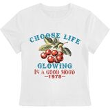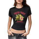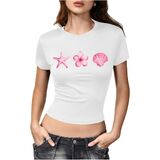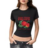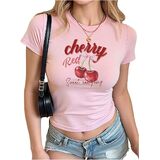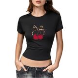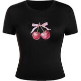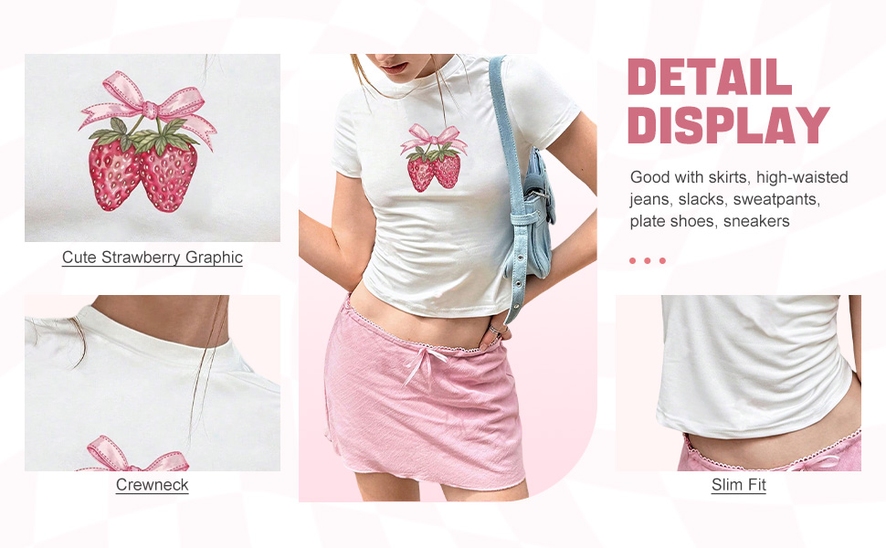 • المزايا: قميص بأكمام قصيرة ورقبة دائرية مع تصميم طباعة جرافيك على شكل فيونكة الفاكهة، طول قصير، مقاس نحيف يظهر خط جسمك الجميل