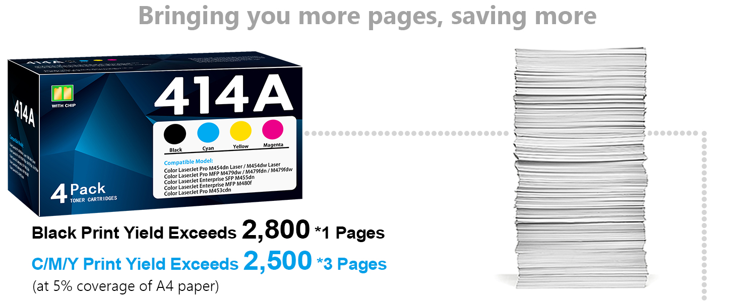 إنتاجية عالية للصفحة: ما يصل إلى 2800 صفحة لكل خرطوشة حبر أسود 414A، 2500 صفحة لكل خرطوشة حبر سماوي 414A، خرطوشة حبر أرجواني 414A، خرطوشة حبر أصفر 414A (تغطية 5% على ورق/حرف A4)