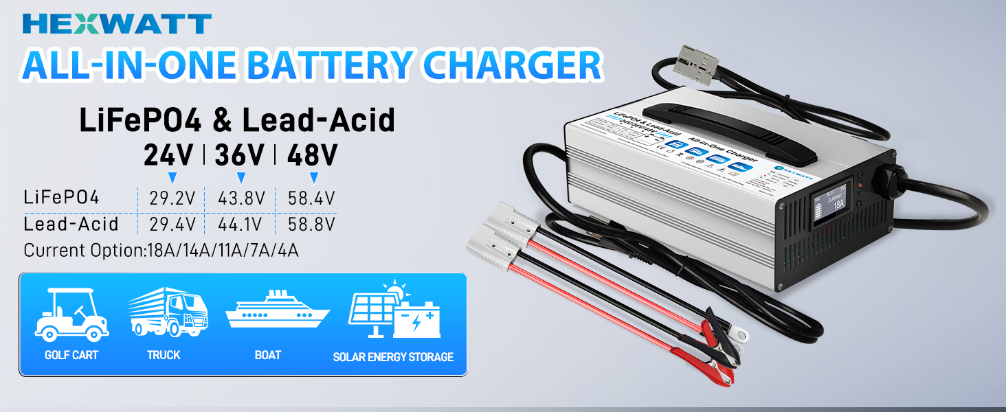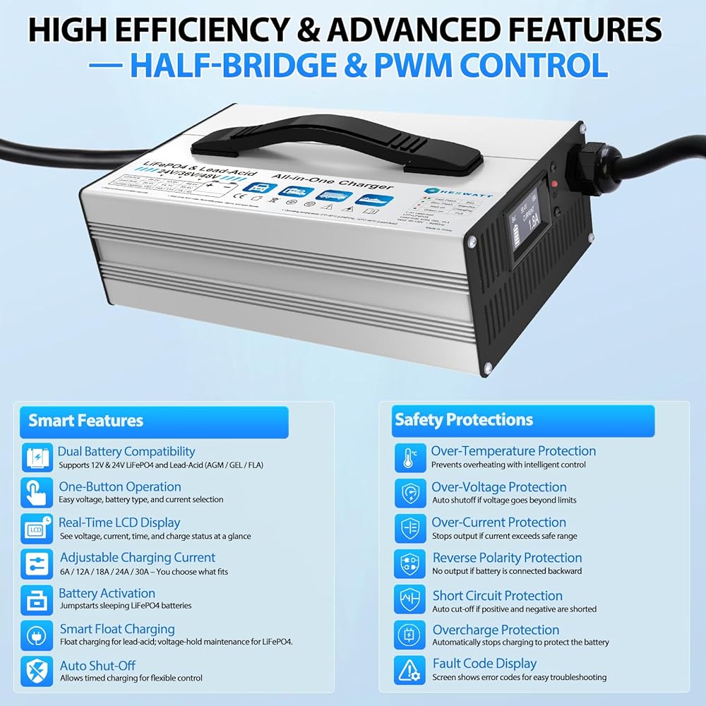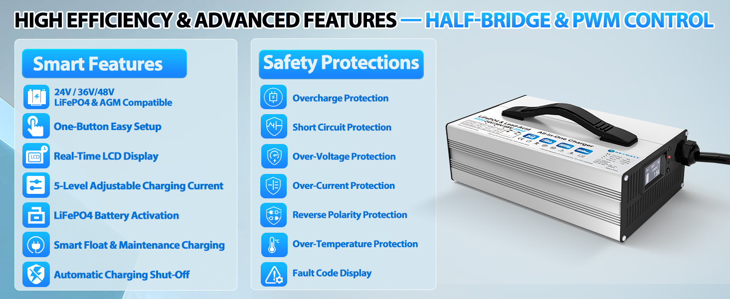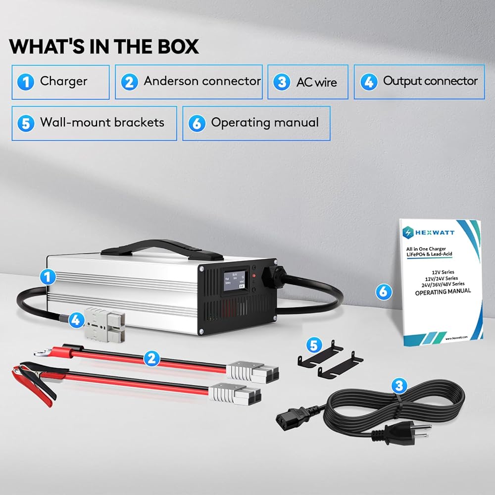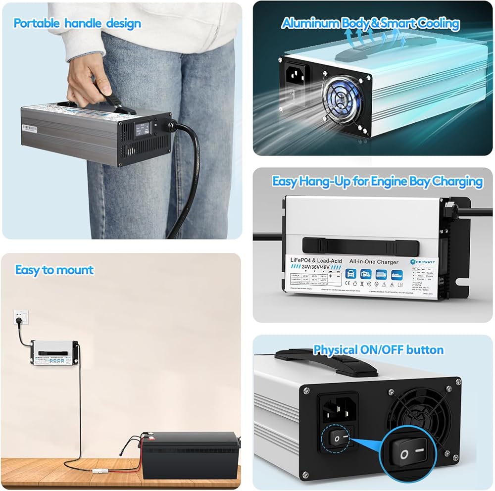 ✅[يدعم بطاريات LiFePO4 وبطاريات الرصاص الحمضية 24 فولت/36 فولت/48 فولت] يتوافق هذا الشاحن متعدد الاستخدامات مع أنظمة البطاريات 24 فولت و36 فولت و48 فولت، ويدعم كلاً من بطاريات LiFePO4 وبطاريات الرصاص الحمضية (AGM، GEL، FLA). مثالية لعربات الجولف والرافعات الشوكية وتخزين الطاقة الشمسية والمعدات الصناعية.