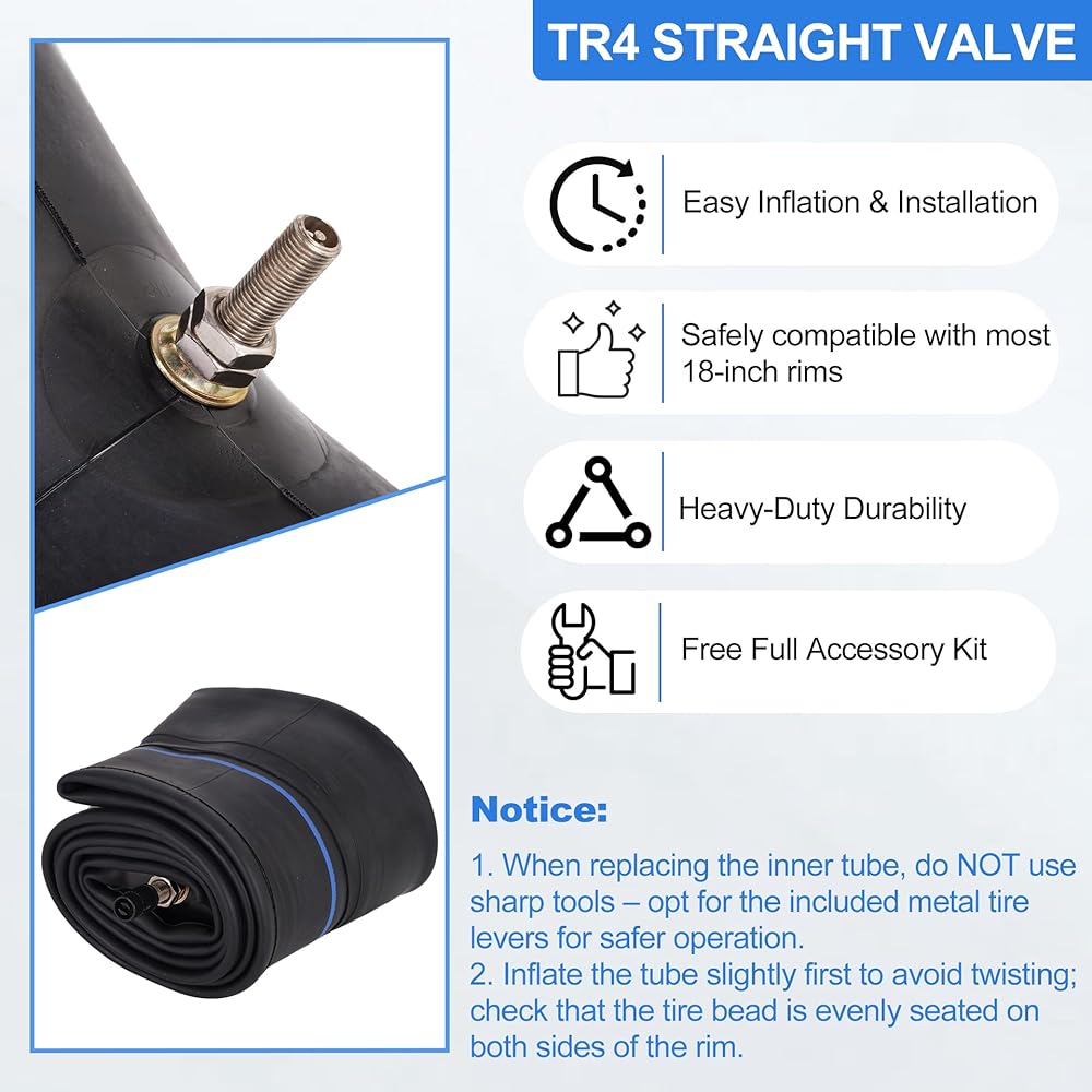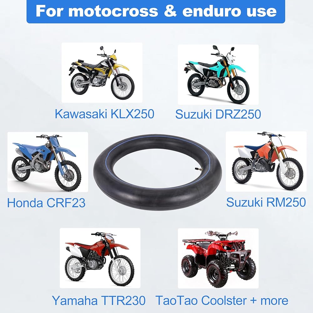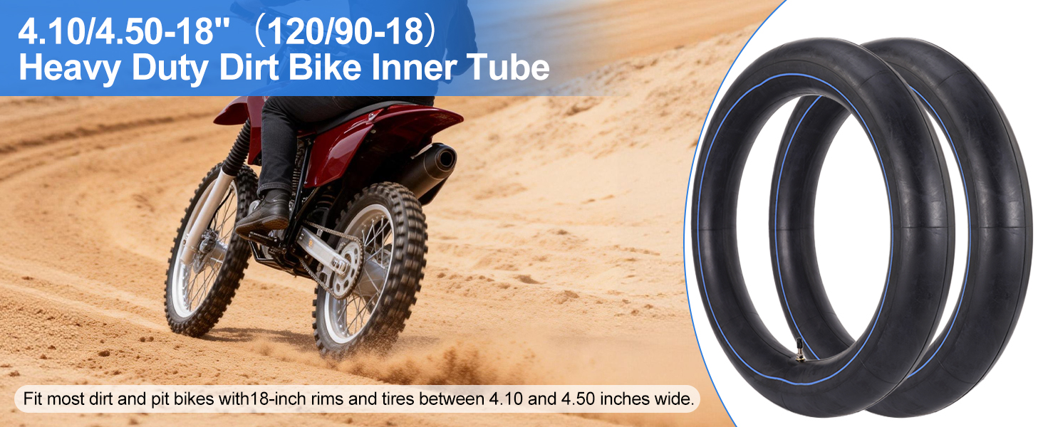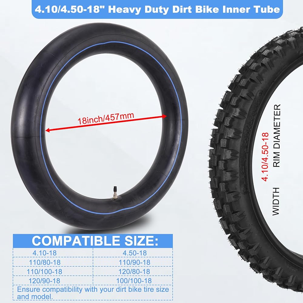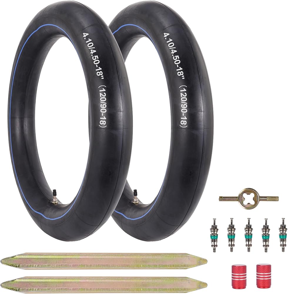 عبوتان من القيمة والتوافق الواسع. هذا الأنبوب الداخلي عالي التحمل المكون من عبوتين يناسب مقاسات الإطارات 120/90-18، 4.10/4.50-18، 110/80-18، 110/90-18، 100/100-18 و18 بوصة. يعمل مع هوندا CRF230/CRF250، ياماها TTR230/TTR250، سوزوكي DRZ250/DR200، كاواساكي KDX200/KLX250، تاوتاو وكولستر الدراجات الترابية.