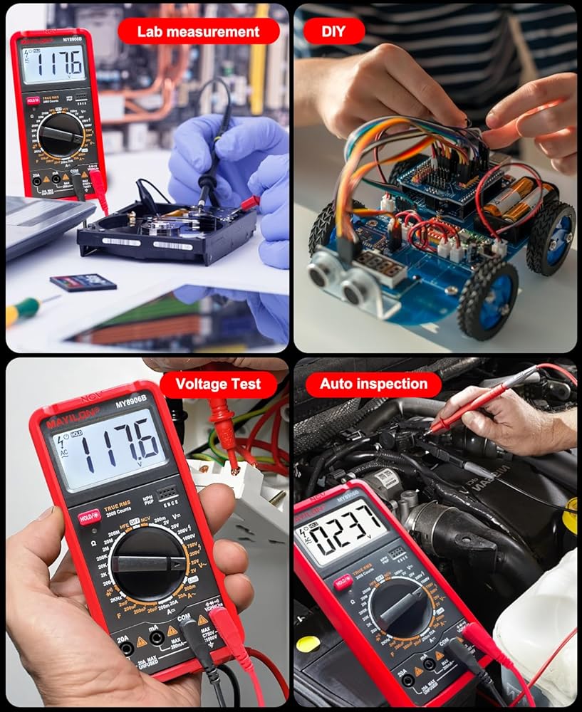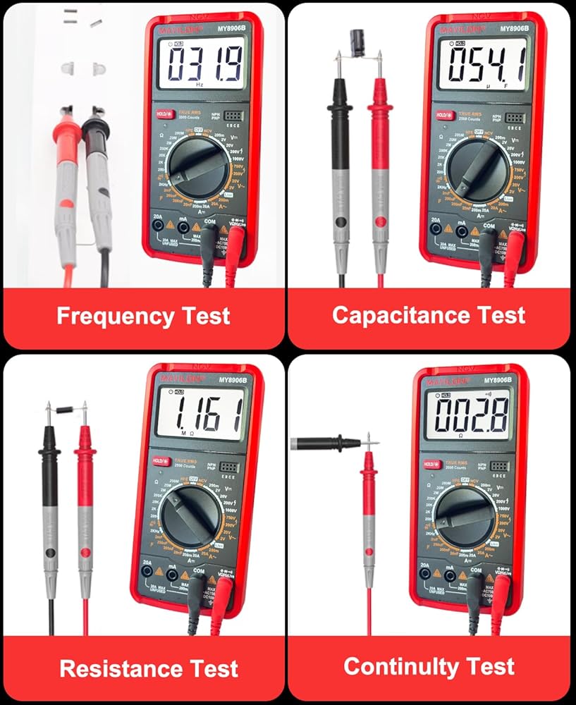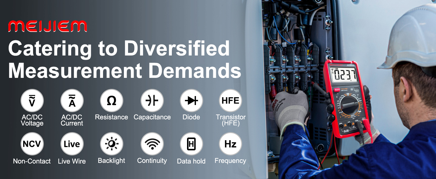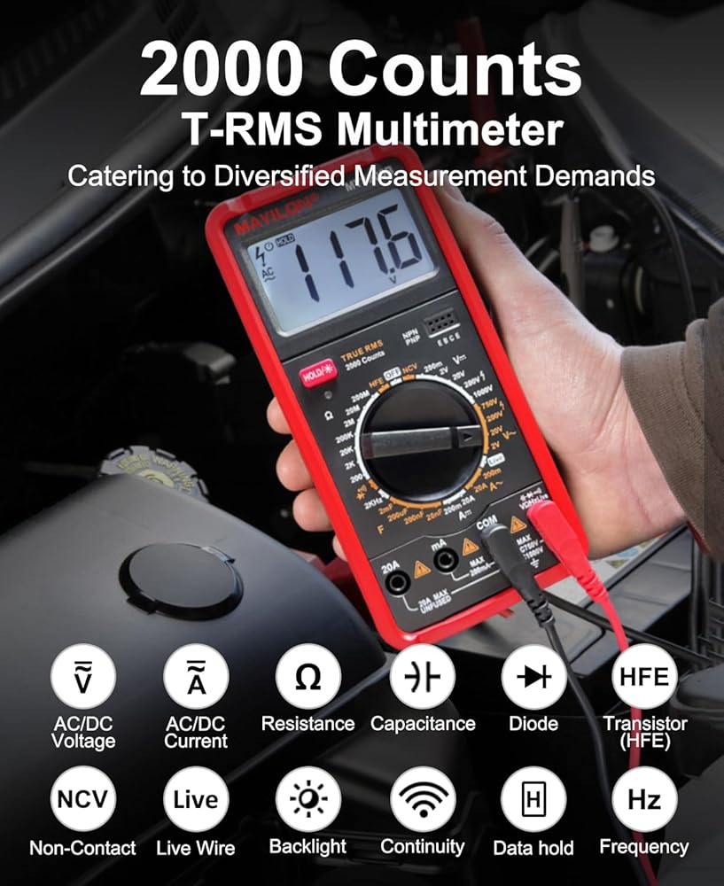 عداد متعدد: هذا جهاز متعدد حقيقي عالي الأداء RMS مزود بدائرة حماية كاملة المزايا من الحمل الزائد، يمكنه قياس الجهد الكهربي AC/DC، تيار AC/DC، المقاومة، السعة، الثنائيات، الترانزستورات (hFE)، التردد، الاستمرارية، NCV، والأسلاك المباشرة، وهو مناسب للمنافذ المنزلية، والصمامات، والبطاريات، واستكشاف أخطاء دائرة السيارات وإصلاحها، وفحص نظام الشحن، واختبار الأجهزة الإلكترونية داخل السيارة