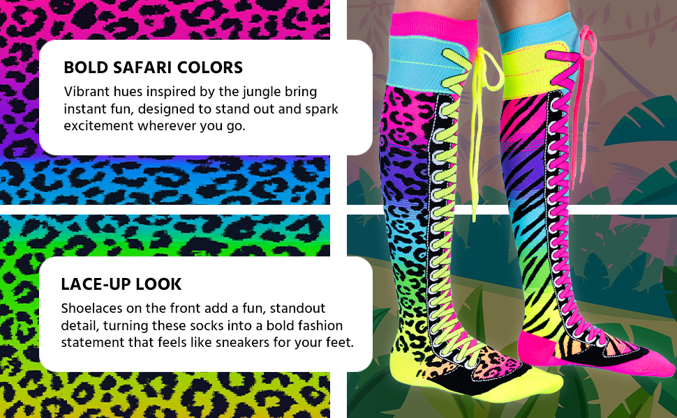 وقت الانطلاق: ستشعر وكأنك دائمًا في مغامرة سفاري في جوارب MADMIA Safari الخاصة بك. في مزيج رائع من طبعة الفهد والحمار الوحشي، يكتمل تصميم الدانتيل الأمامي بأربطة حقيقية في الأعلى!