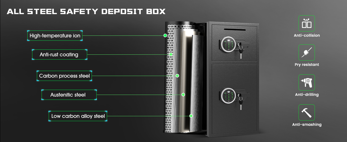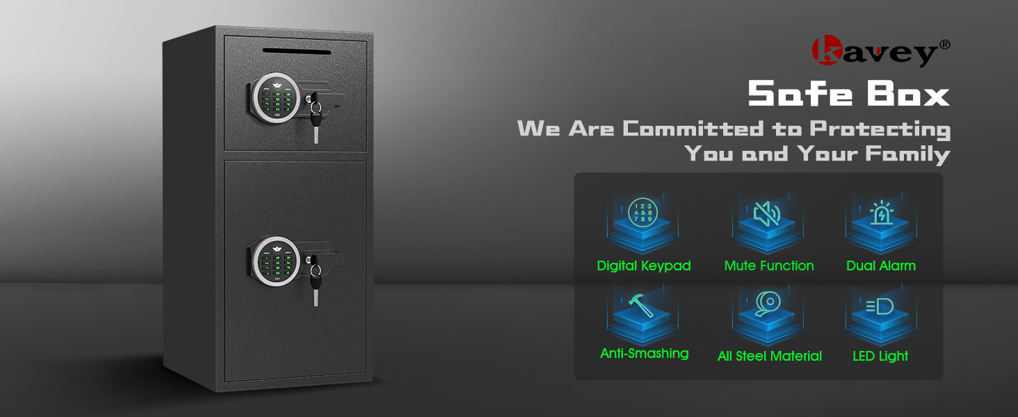 【هيكل متين مضاد للسرقة】 تم تصميم Kavey Safe من سبائك الفولاذ المعززة منخفضة الكربون، وتتميز بتصميمات ذات فتحات دقيقة مقطوعة بالليزر لتعزيز مقاومة النقب. يضمن الباب السميك المضاد للنزع، جنبًا إلى جنب مع 5 براغي قفل حية صلبة، حماية موثوقة. يعد هذا الصندوق الآمن المقاوم للحريق خيارًا ممتازًا لتأمين الأشياء الثمينة في المنزل أو المكتب أو للاستخدام التجاري.