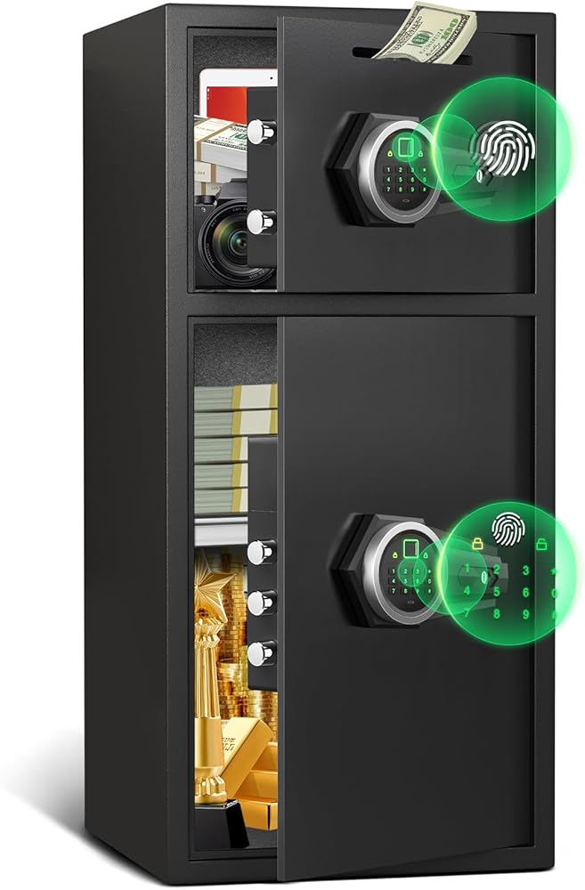 【آمنة ذات سعة كبيرة بباب مزدوج】 بأبعاد خارجية تبلغ 13.8 بوصة عمق × 13.8 بوصة عرض × 25.5 بوصة ارتفاع، توفر هذه الخزنة الكبيرة تصميمًا مزدوجًا واسعًا للباب، مما يسمح بتشغيل مستقل لمقصورتين للتخزين المرن. إنها مثالية لتنظيم المستندات والمجوهرات والنقود والأسلحة النارية وغيرها من الأشياء الثمينة. الجزء الداخلي مبطن بمادة فلانيليت ناعمة لحماية العناصر من الخدوش أو التلف.