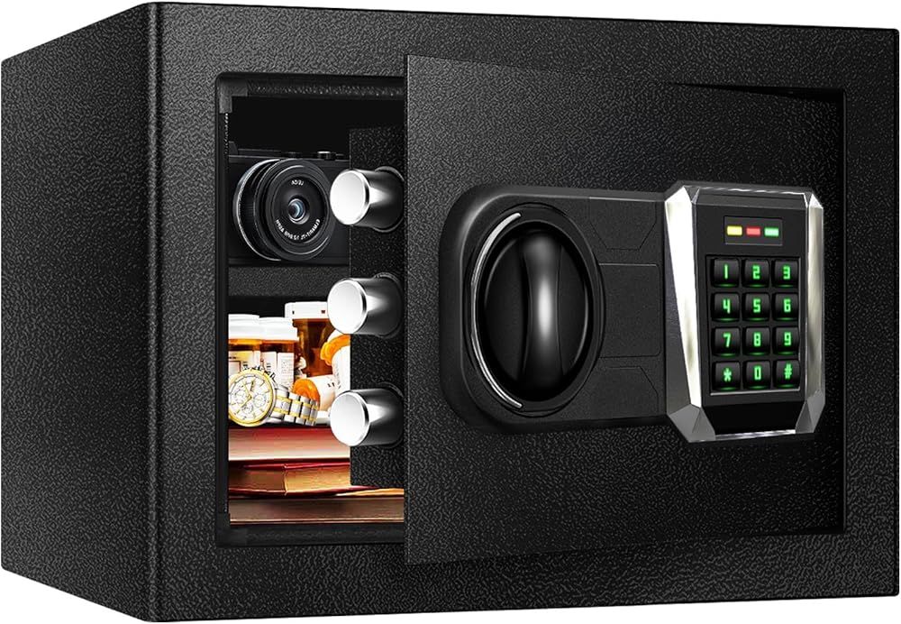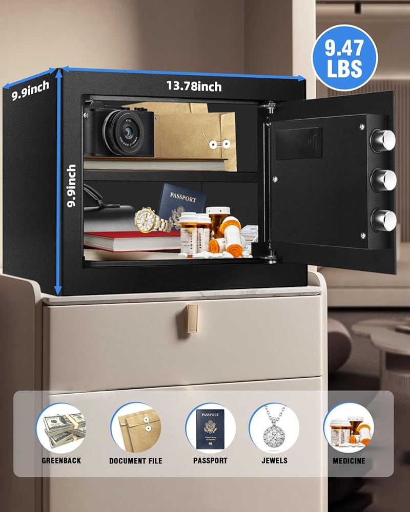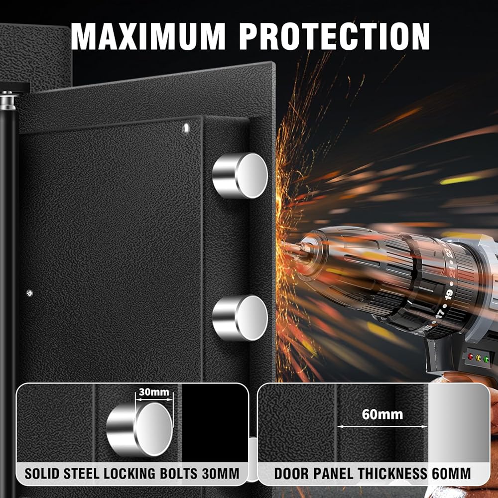 【أداء قوي وعالي الأمان】خزانة المنزل المقاومة للماء والحريق مصنوعة من هيكل فولاذي صلب متين، تصميم باب مدمج بسمك 60 مم يعزز القدرة على مقاومة النزع، ومسامير القفل الصلبة المعززة 30 مم تقاوم الهجمات الجسدية بشكل فعال، كما تقاوم تقنية القفل المتقدمة الهجمات الجسدية والتلاعب بالقفل لضمان سلامة مقتنياتك الثمينة. تم اختبار هذه الخزنة المنزلية بدقة لإثبات متانتها وجودة موادها الفائقة.