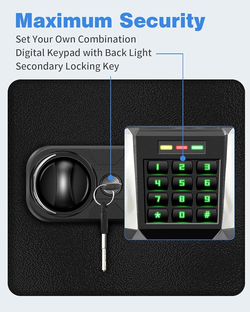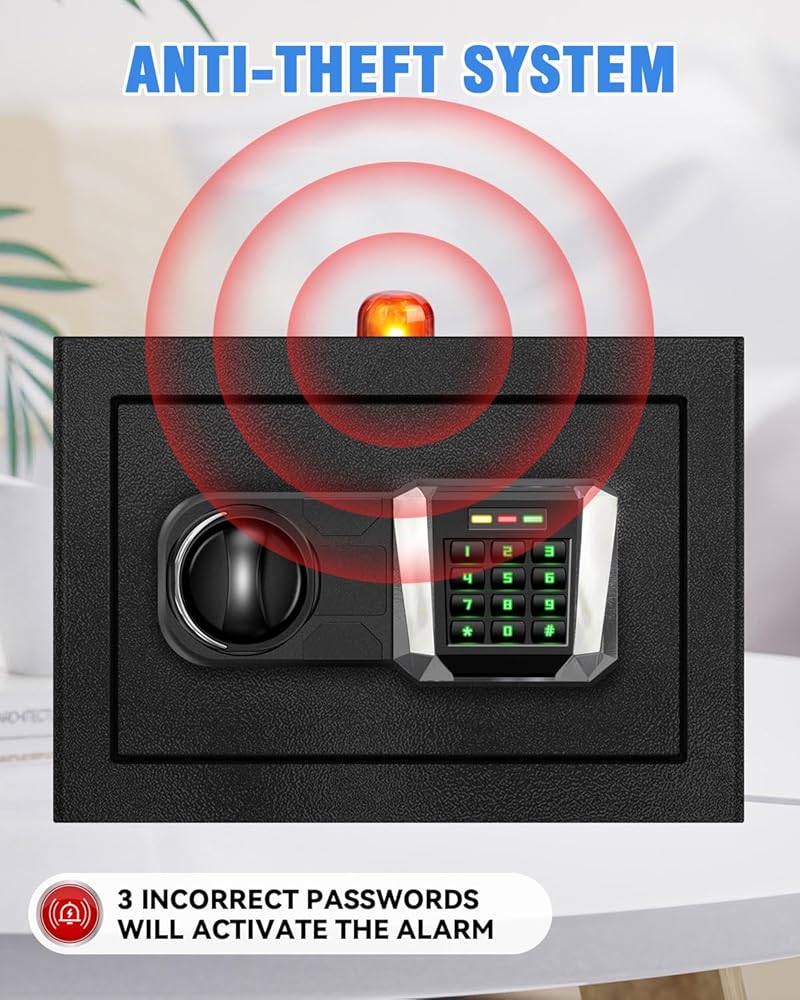 【إنذار مضاد للسرقة وتصميم ثابت】تحتوي الخزائن المخصصة للاستخدام المنزلي ومقاومة للحريق والماء على نظام إنذار ذكي لمنع الدخول غير المصرح به. إذا قمت بإدخال رمز خاطئ ثلاث مرات، فسيتم تنشيط نظام الإنذار. كما أنها تحتوي على فتحات تثبيت مثقوبة مسبقًا وتأتي مع براغي توسيع لتركيب الخزنة على الحائط أو الأرضية أو رف الخزانة لمنع مخاطر السرقة.