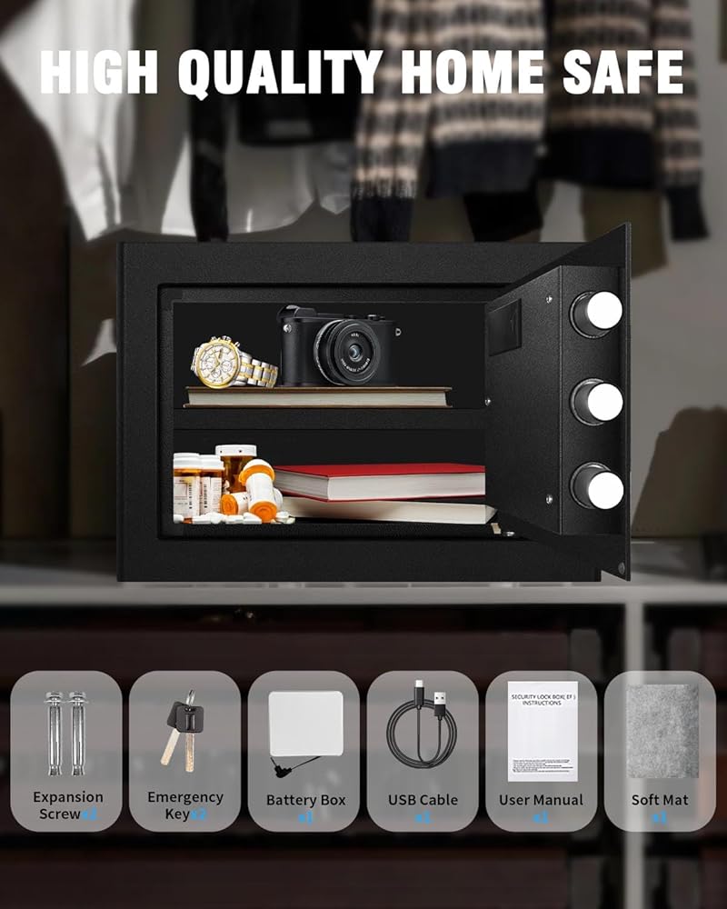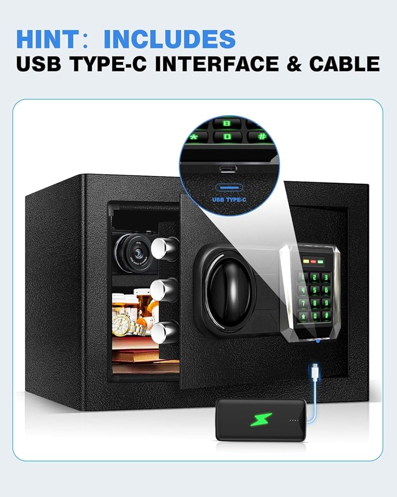 【صندوق آمن ذو سعة مثالية مع USB من النوع C】يأتي مع رف قابل للإزالة، مثالي لتخزين العناصر في جميع أنحاء المنزل مثل النقود والأدوية والمجوهرات والمستندات الحساسة ومحركات التخزين الإلكترونية وبطاقات الائتمان الاحتياطية والأسلحة النارية. في حالة فشل البطارية، يمكنك استخدام كابل USB من النوع C كمصدر طاقة احتياطي لفتح صندوق الأمان، مما يمنع حدوث مشكلات بسبب البطارية الفارغة أو المفاتيح المفقودة. [ملاحظة] يتم تضمين كابل USB من النوع C، ولكن بنك الطاقة غير متضمن.