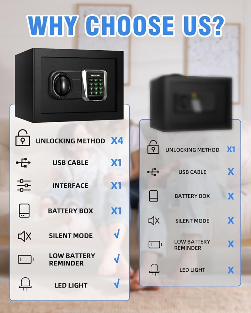 【3 طرق لفتح صندوق الخزنة】 1) كلمة المرور + المقبض. 2) مفتاح الطوارئ + المقبض. عندما تحصل على الخزنة المقاومة للحريق لأول مرة، استخدم المفتاح لفتح الباب. 3) كابل USB من النوع C + بنك الطاقة + مقبض. ملاحظة: لا تقم بتخزين مفاتيح الطوارئ الخاصة بك خارج الخزنة، فهذا سيساعدك حقًا عند نسيان كلمات المرور أو عند نفاد البطاريات.