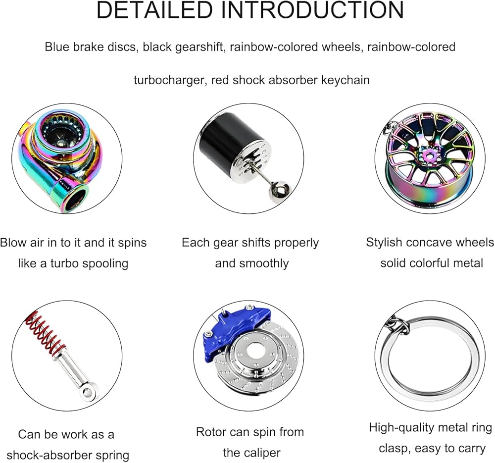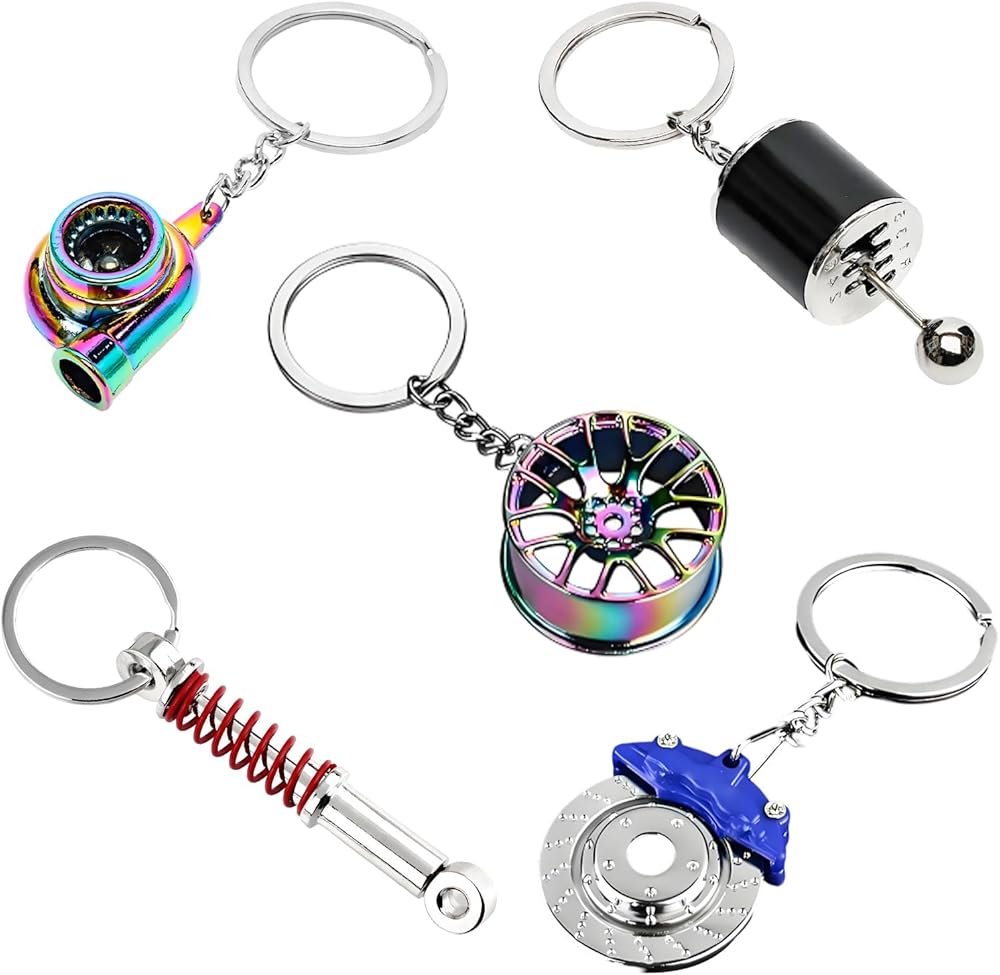 Package Included: You will receive a set of five exquisitely crafted automotive-themed keychains, including a turbo, a wheel rim, a manual transmission, a brake rotor, and a shock absorber with spring. This feature enables you to effortlessly adapt them to suit your daily mood and style preferences