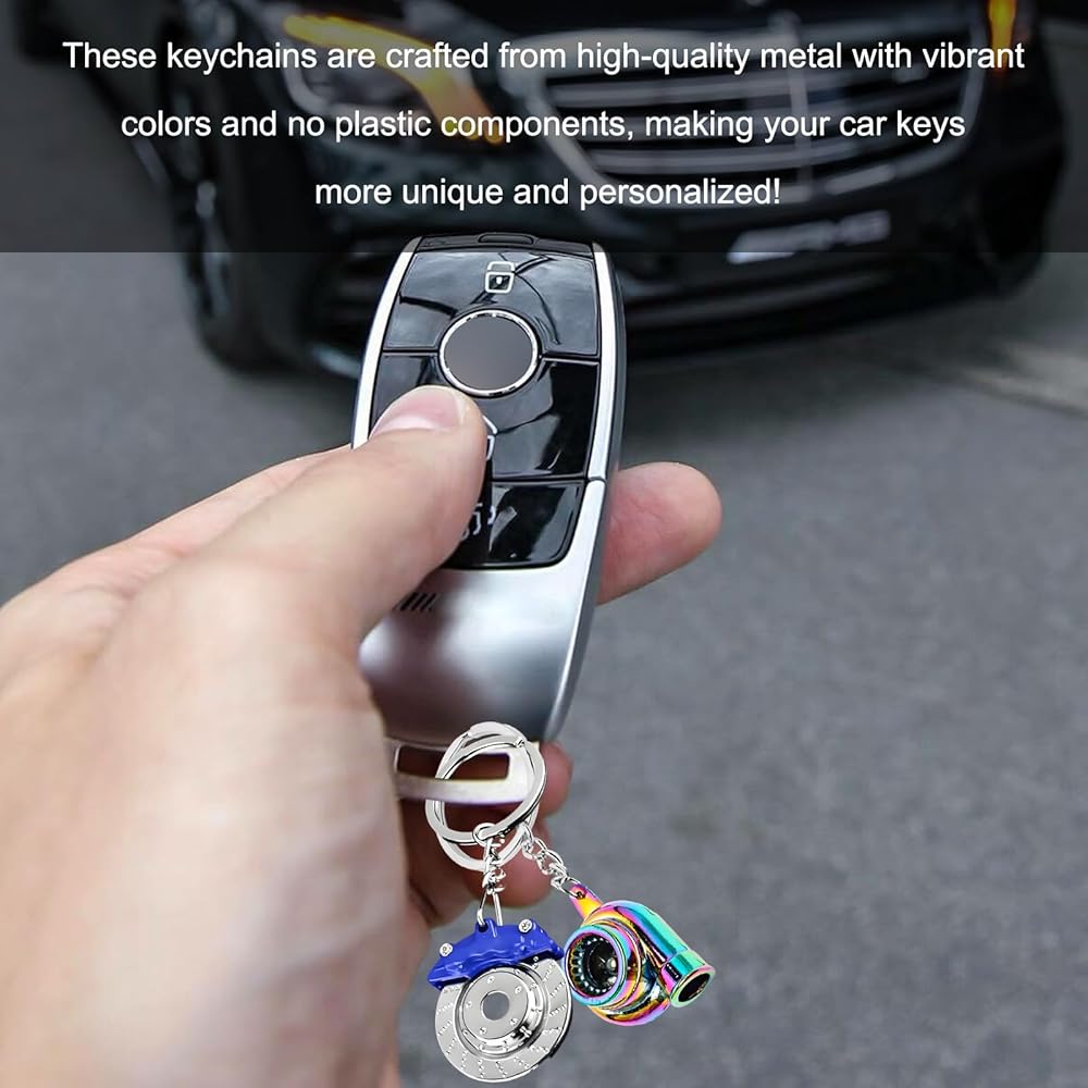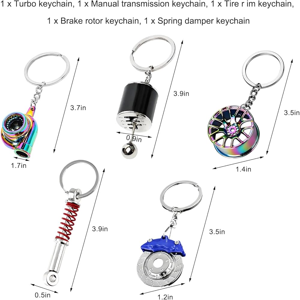 Package Includes: 1 Turbo Keychain, 1 Manual Transmission Keychain, 1 Tire Rim Keychain, 1 Brake Rotor Keychain, 1 Spring Damper Keychain