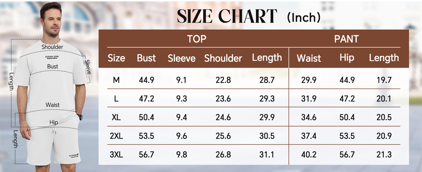 العناية بالملابس: أطقم ملابس قصيرة للرجال مكونة من قطعتين للصيف، بدلة رياضية للرجال مكونة من قطعتين متوفرة بمقاسات M-3XL. يرجى الرجوع إلى مواصفات مقاس الملابس في الصورة على اليسار قبل الشراء. يُغسل في الغسالة أو يدويًا بالماء البارد/ يُعلق أو يعلق ليجف/ بدون استخدام مبيضات/ بدون تنظيف جاف.