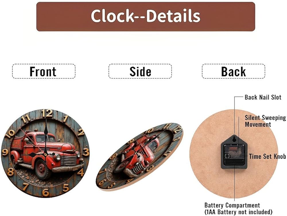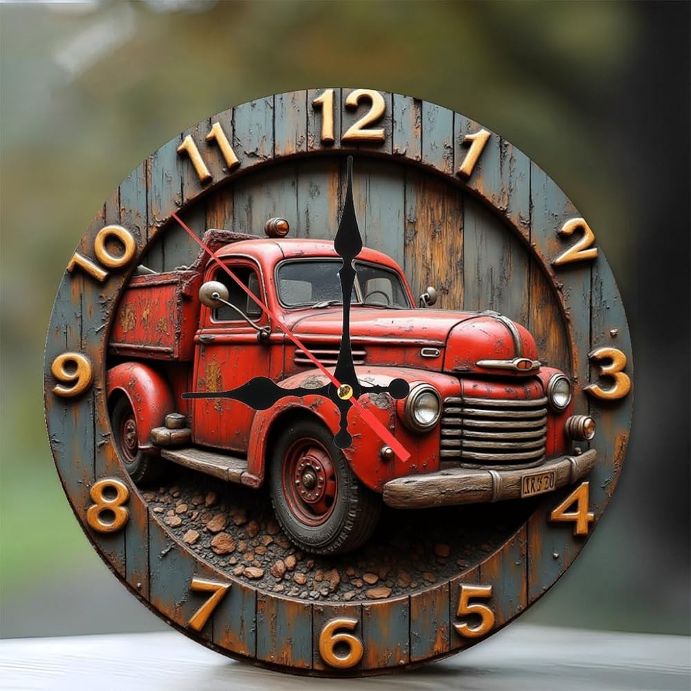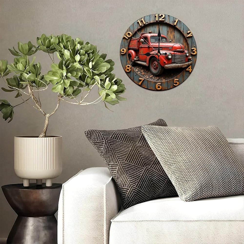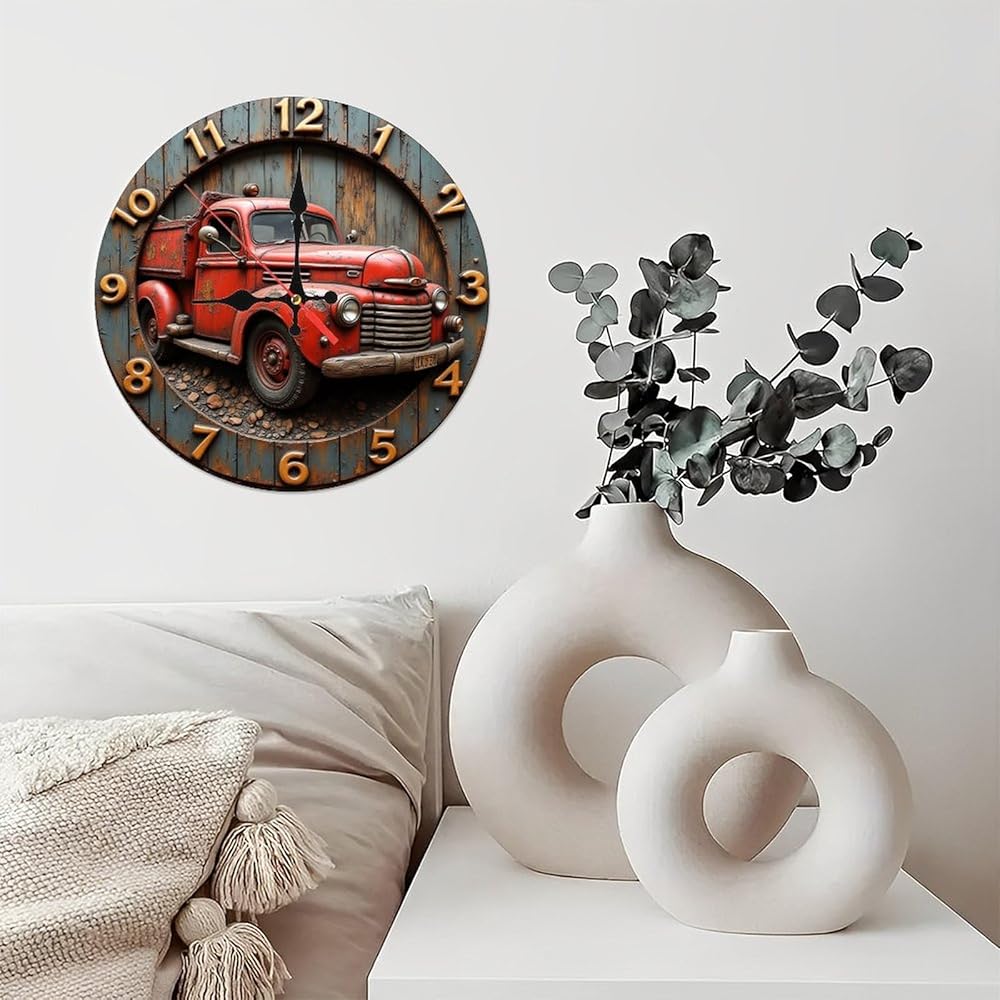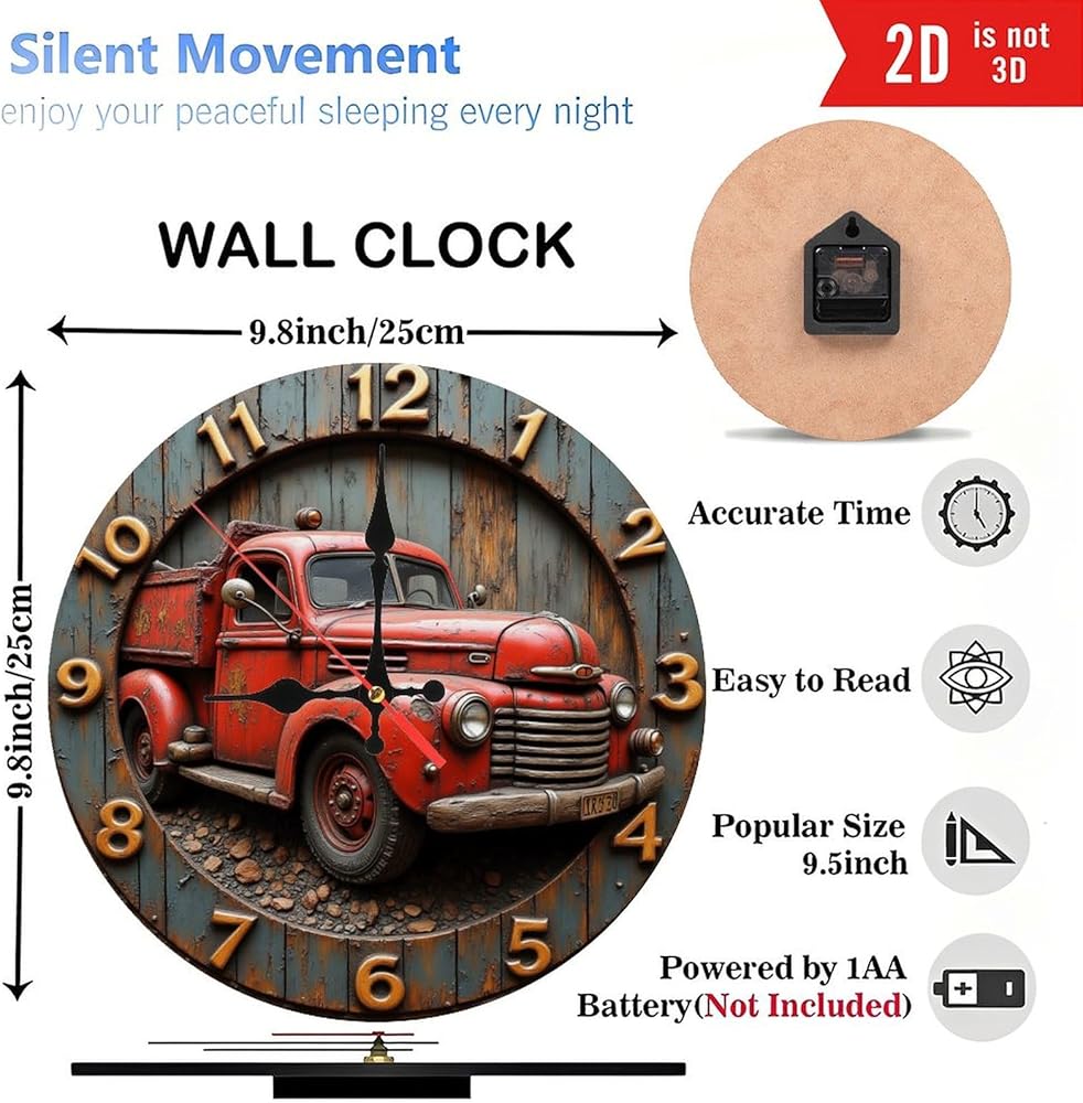 ساعة حائط على شكل شاحنة حمراء عتيقة لديكور المنزل، ساعة حائط خشبية مقاس 10 بوصة، حركة صامتة، تعمل بالبطارية (بطاريات AA غير متضمنة)، ديكور منزلي فني، مثالية لهجات المنزل