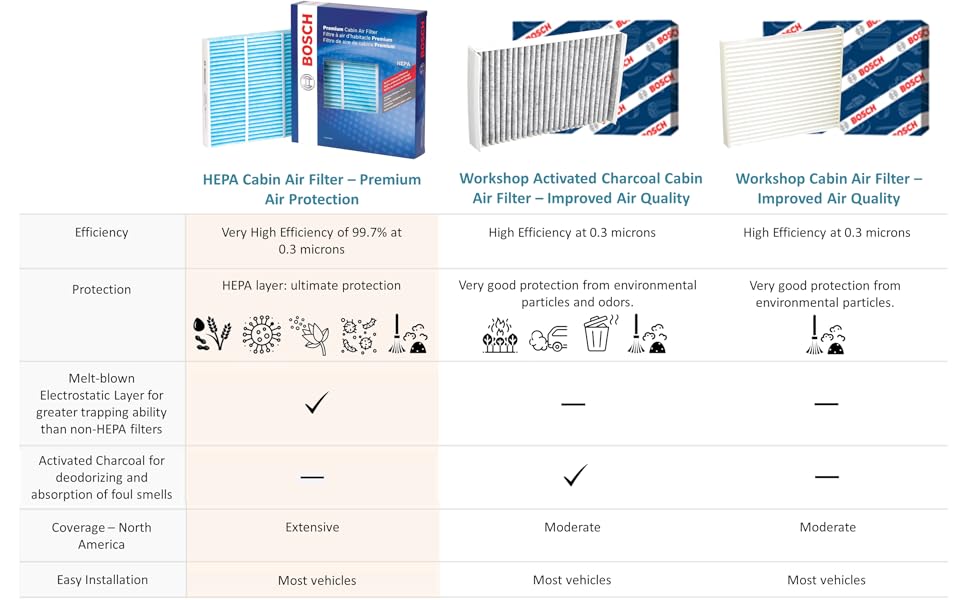 • Bosch HEPA Premium Cabin Air Filters are designed and tested to meet High Efficiency Particulate Air (HEPA) standards based on ISO 29463-3:2011 and provide filtration efficiency of 99.97% at 0.3 microns
