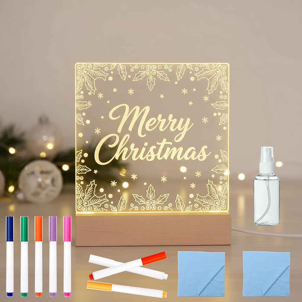 【مجموعة أزياء ذات قيمة رائعة】 لوح مسح جاف من الأكريليك مقاس 5.9 × 5.9 بوصة مع حامل خشبي بإضاءة LED ملونة يخلق رقيًا فوريًا. تتضمن 8 أقلام تحديد ملونة سريعة الجفاف، و2 قطعة قماش من الألياف الدقيقة وزجاجة رش واحدة، اكتب رسائل تذكير نابضة بالحياة تبقى منتعشة لعدة أيام، ثم امسحها دون عناء. مثالية لتذكير رسائل المكتب، والملاحظات المنزلية الإبداعية وعلامات الترحيب لأصدقائك. سيطر على الفوضى في كل مكان، والعصف الذهني المكتبي، ومخططات المهام العائلية، ومركز قيادة المطبخ.