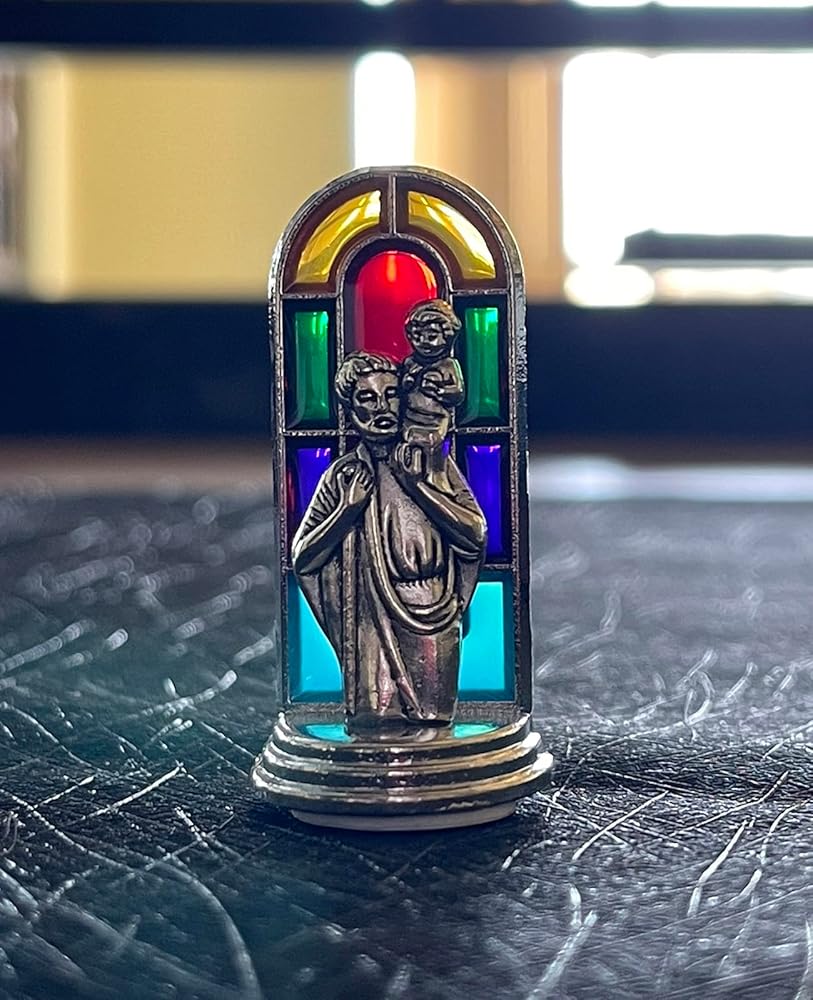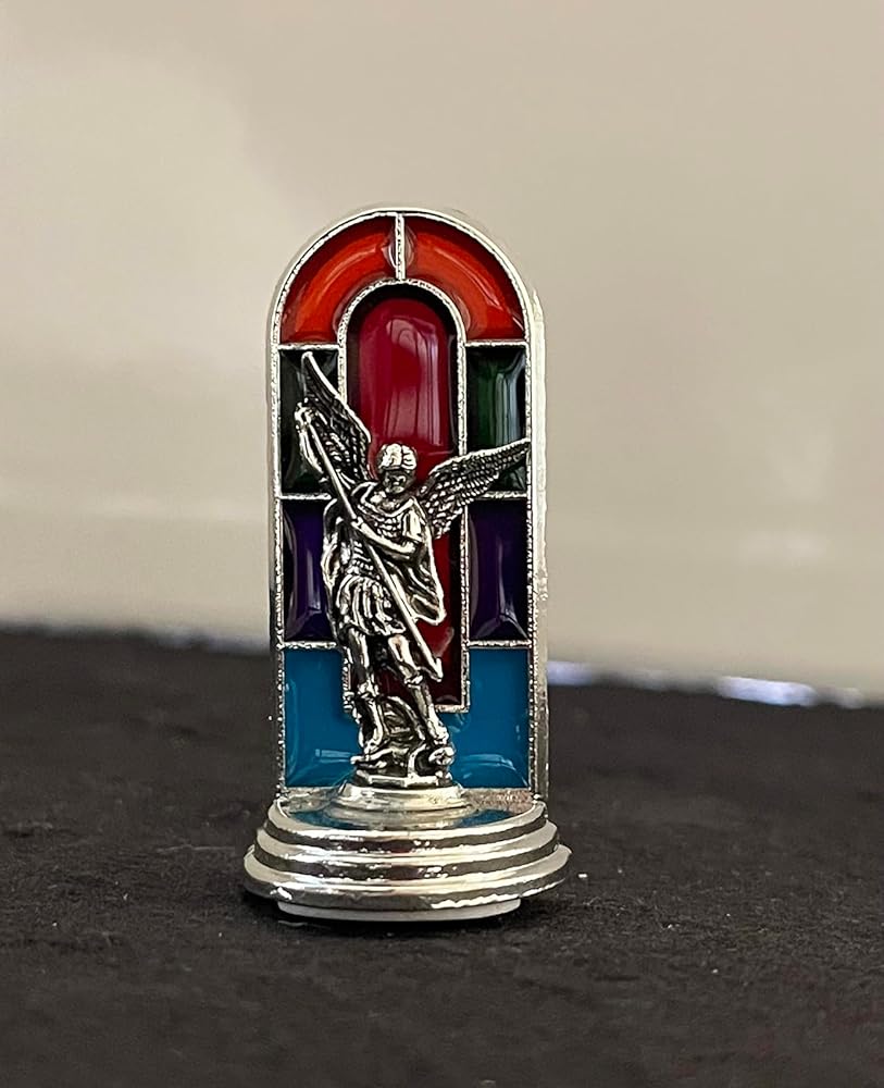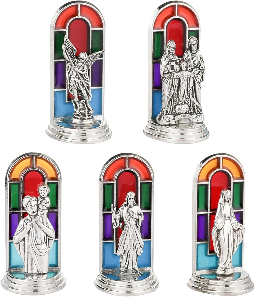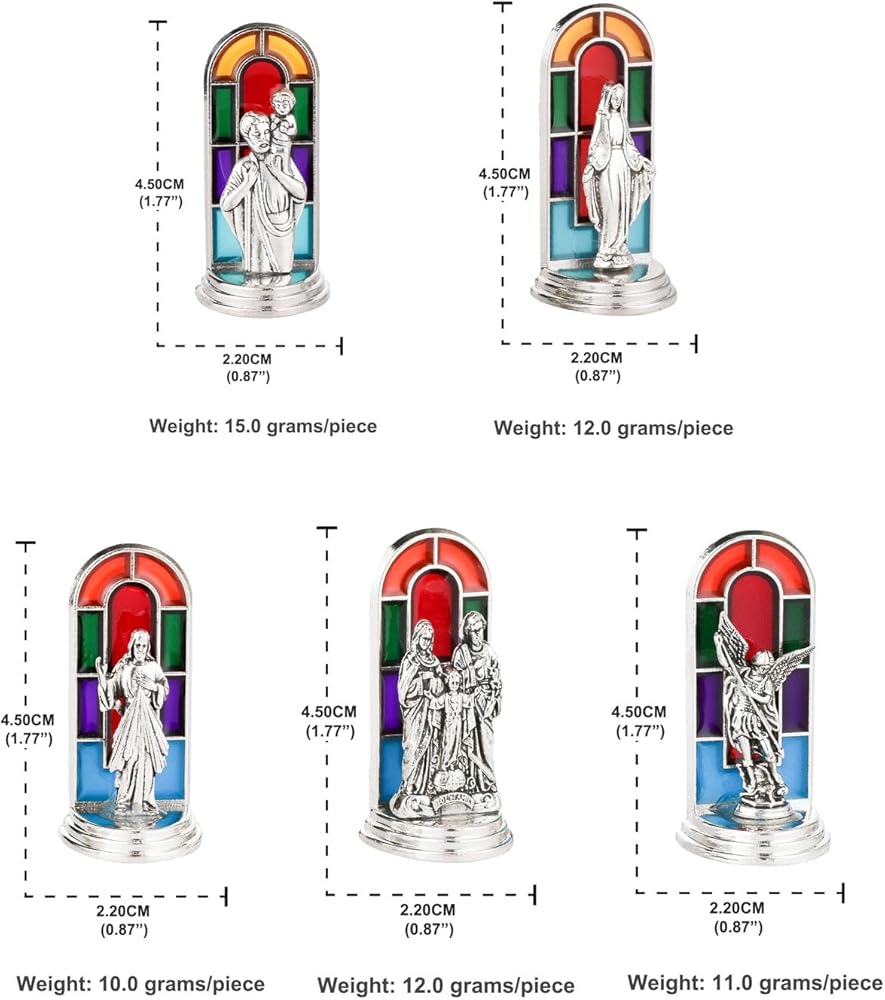5 قطع تماثيل صغيرة مزيج سانت كريستوفر سانت مايكل العائلة المقدسة الرحمة الإلهية سيدة سيدة دينية تمثال أيقونة نافذة الكنيسة الملون خلفية ديكور المنزل زخرفة السيارة مع قاعدة قابلة لللصق