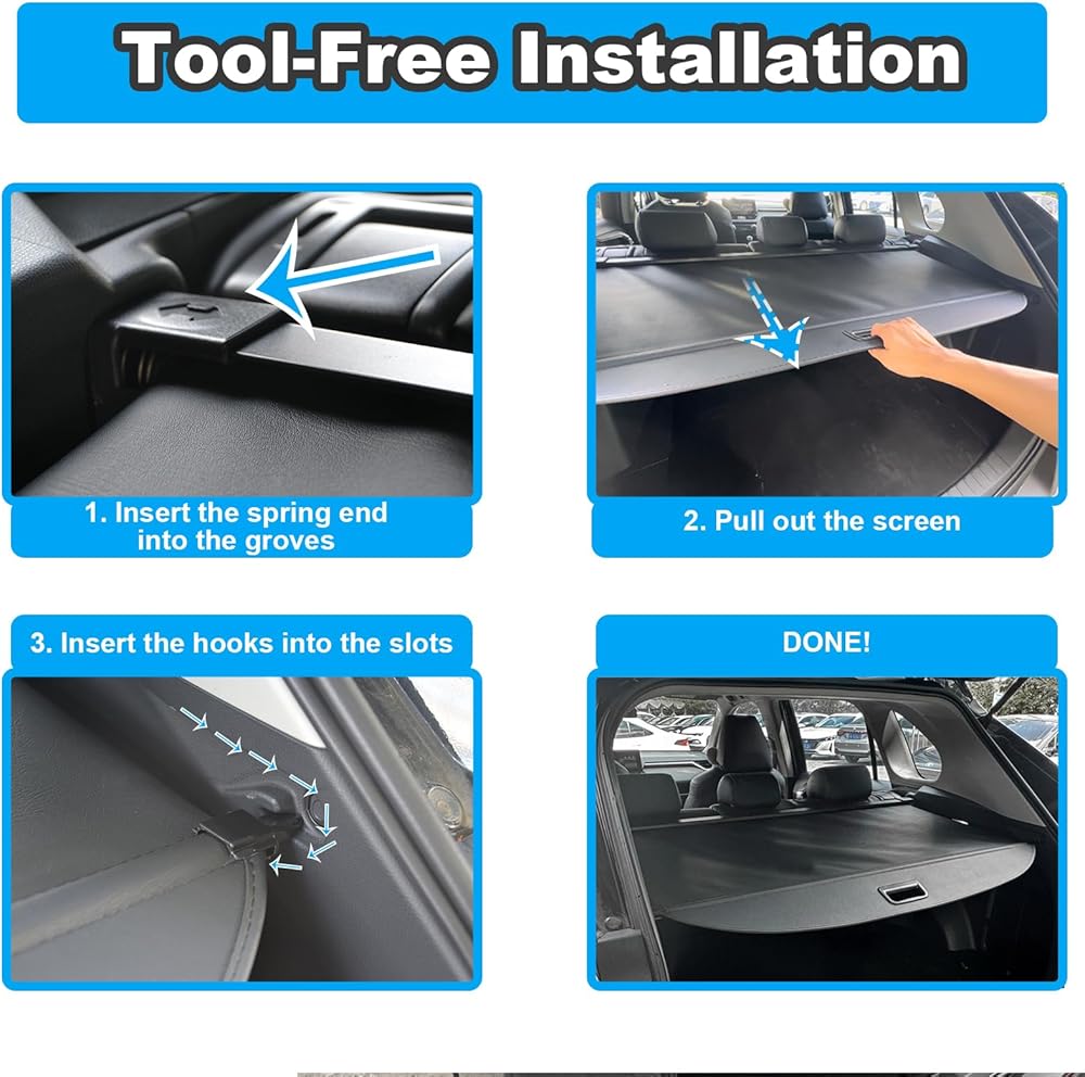 [ملاءمة مخصصة وتركيب بدون أدوات] مصمم لسيارة Chevy Equinox EV، يتميز غطاء الحمولة هذا بتصميم سريع التركيب - بدون حفر أو أدوات أو ضرر لسيارتك. فقط اضغط وأدخل في الأخاديد.