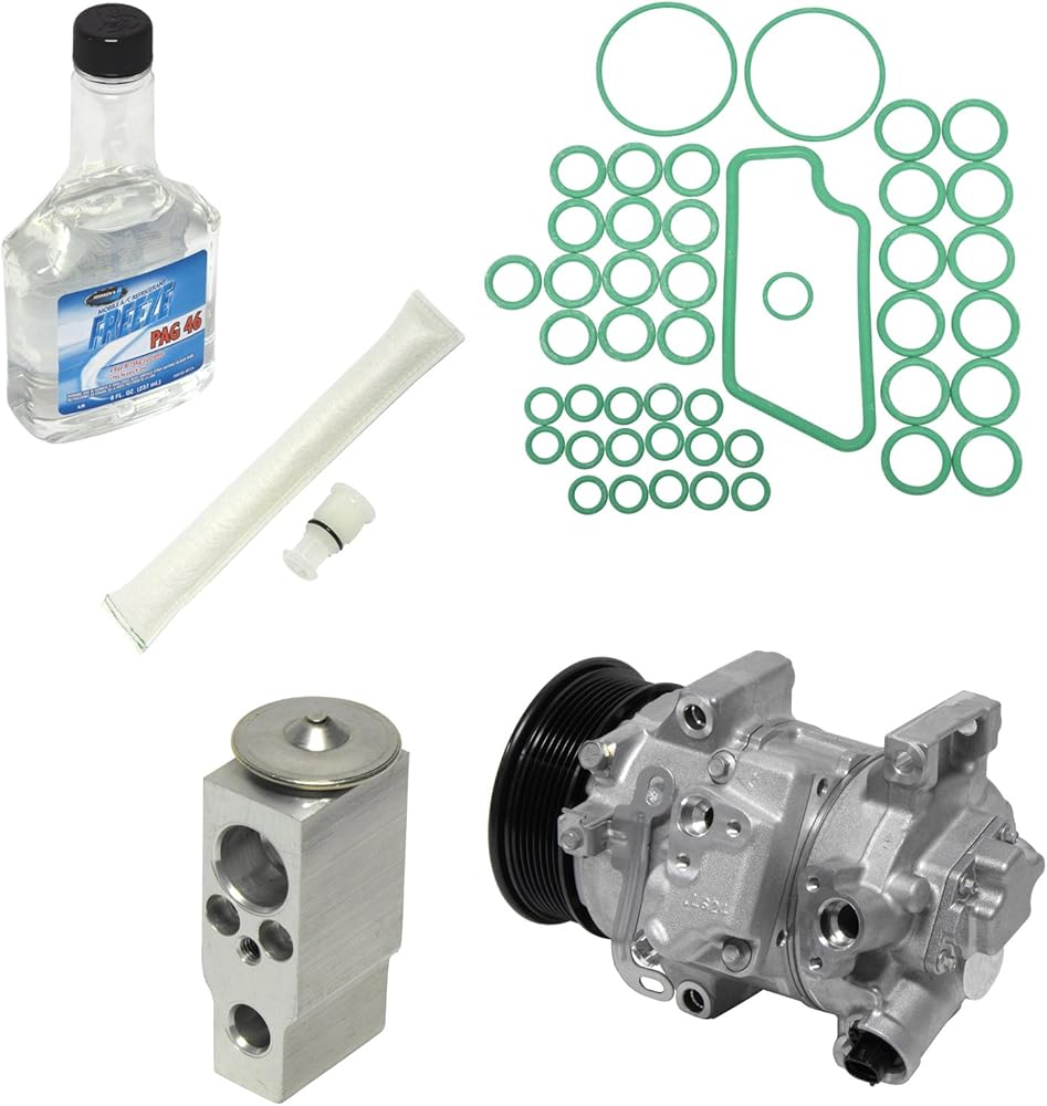 Includes: compressor & clutch, drier / accumulator, expansion device, 8oz bottle of PAG oil, seal kit; compressor may come charged with shipping oil to keep the part lubricated during transit - drain and replace according to your system's requirements