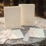 كتب نذور عالية الجودة: اكتب وعودك في كتب نذور الزفاف الأنيقة الخاصة بنا. يتميز كل كتاب له ولها بغلاف صلب من الكتان القوي ولمسات من رقائق الذهب وصفحات مبطنة ناعمة، مما يخلق كتاب ذكريات جميلاً لاحتفالك.