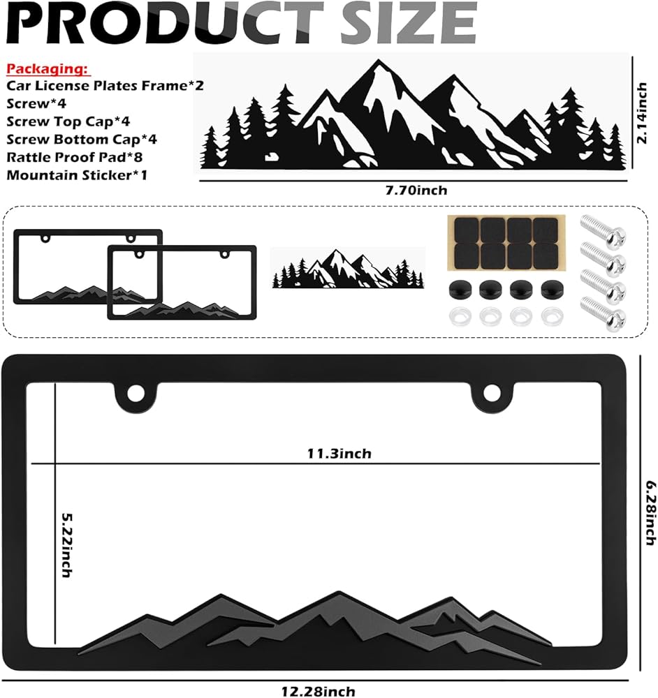 Packaging: Car License Plates Frame*2, Screw*4, Screw Top Cap*4, Screw Bottom Cap*4, Rattle Proof Pad*8, Mountain Sticker*1